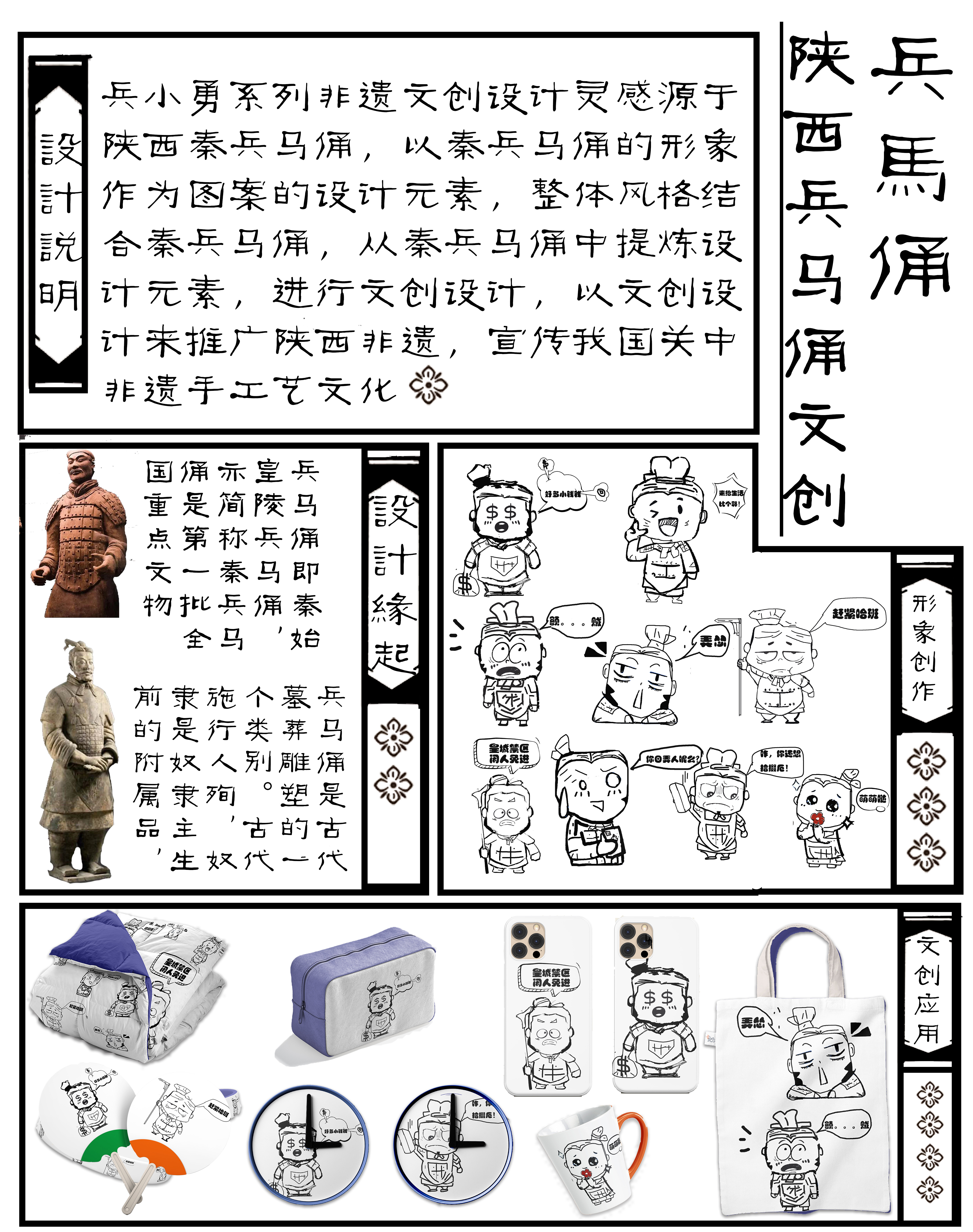 兵马俑,即秦始皇陵兵马俑,亦简称秦兵马俑或秦俑,是第一批全国重点文物保护单位、第一批中国世界遗产,兵小勇系列非遗文创设计灵感源于陕西秦兵马俑,以秦兵马俑的形象作为图案的设计元素,整体风格结合秦兵马俑,从秦兵马俑中提炼设计元素,进行文创设计,以文创设计来推广陕西非遗,宣传我国关中非遗文化。