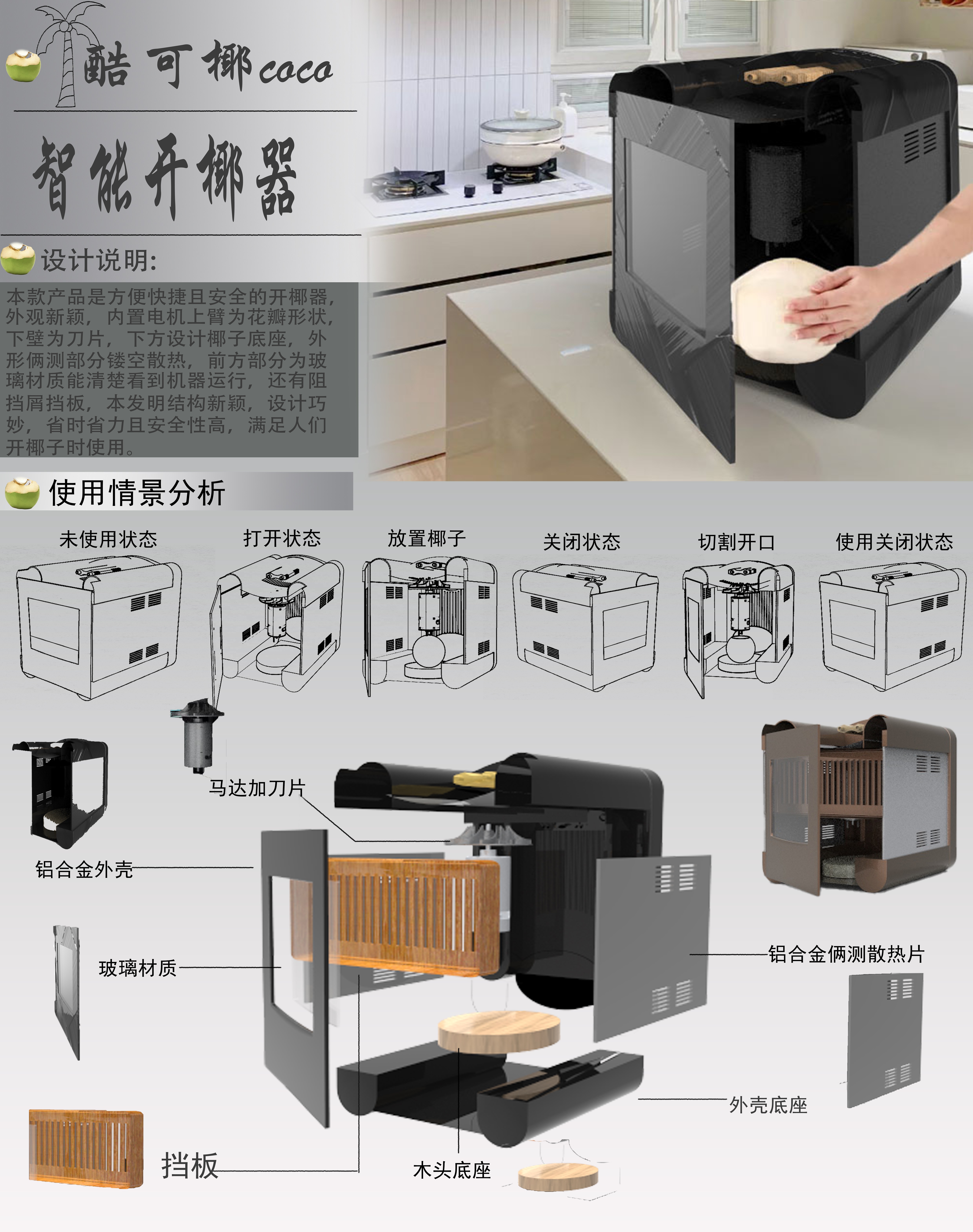 设计说明:本款产品是方便快捷且安全的开椰器,外观新颖,内置电机上臂为花瓣形状,下壁为刀片,下方设计椰子底座,外形俩测部分镂空散热,前方部分为玻璃材质能清楚看到机器运行,还有阻挡碎屑挡板,本发明结构新颖,设计巧妙,省时省力且安全性高,满足人们开椰子时使用。