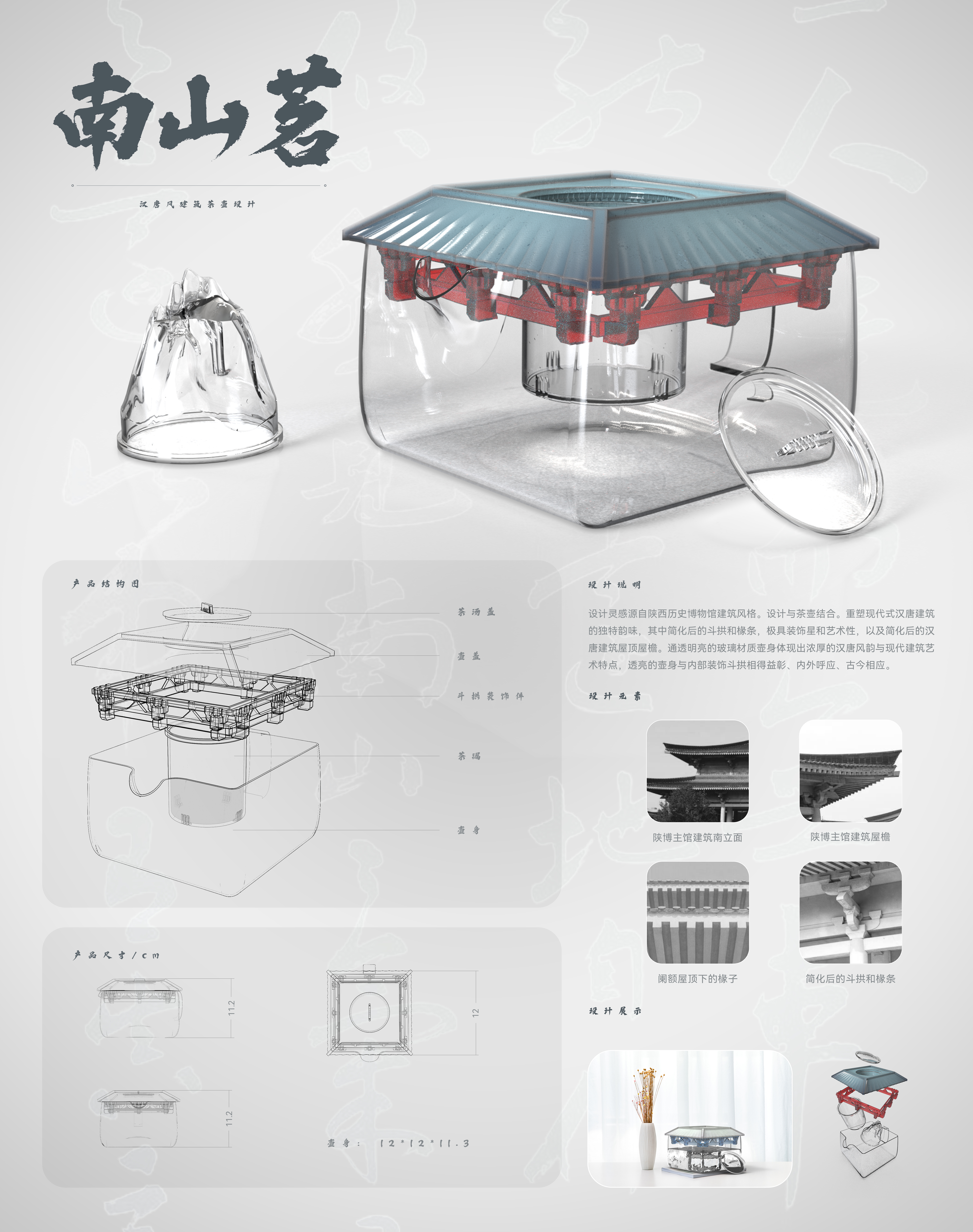 设计灵感源自陕西历史博物馆建筑风格。设计与茶壶结合。重塑现代式汉唐建筑的独特韵味,其中简化后的斗拱和橡条,极具装饰星和艺术性,以及简化后的汉唐建筑屋顶屋檐。通透明亮的玻璃材质壶身体现出浓厚的汉唐风韵与现代建筑艺术特点,透亮的壶身与内部装饰斗拱相得益彰、内外呼应、古今相应。
