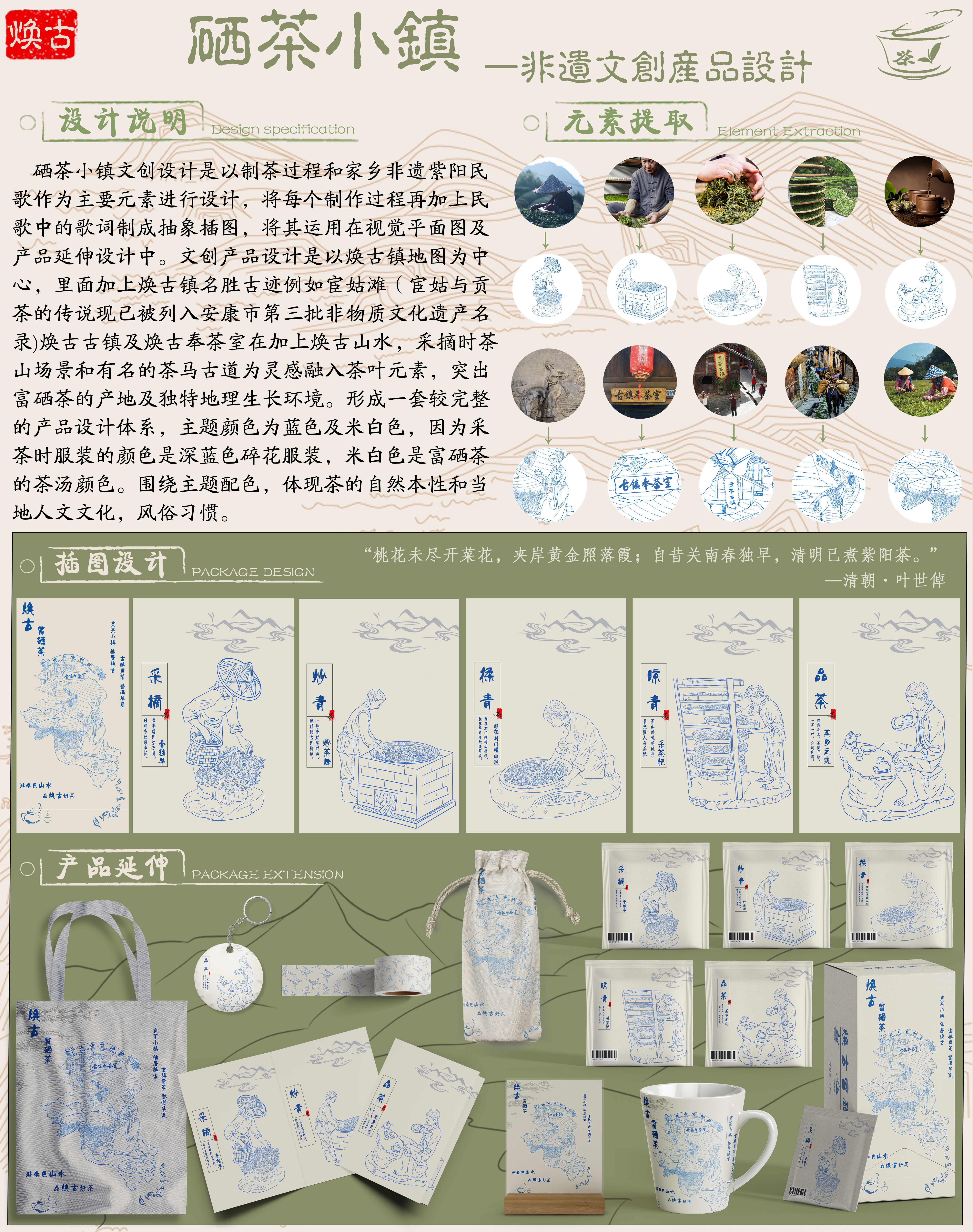 硒茶小镇文创设计是以制茶过程和家乡非遗紫阳民歌作为主要元素进行设计,将每个制作过程再加上民歌中的歌词制成抽象插图。文创产品设计是以焕古镇地图为中心,里面加上焕古镇名胜古迹例如宦姑滩焕古古镇及焕古奉茶室在加上焕古山水,采摘时茶山场景和有名的茶马古道为灵感。突出富硒茶的产地及独特地理生长环境。主题颜色为蓝色及米白色,因为采茶时服装的颜色是深蓝色碎花服装,米白色是富硒茶的茶汤颜色。体现茶的自然本性。