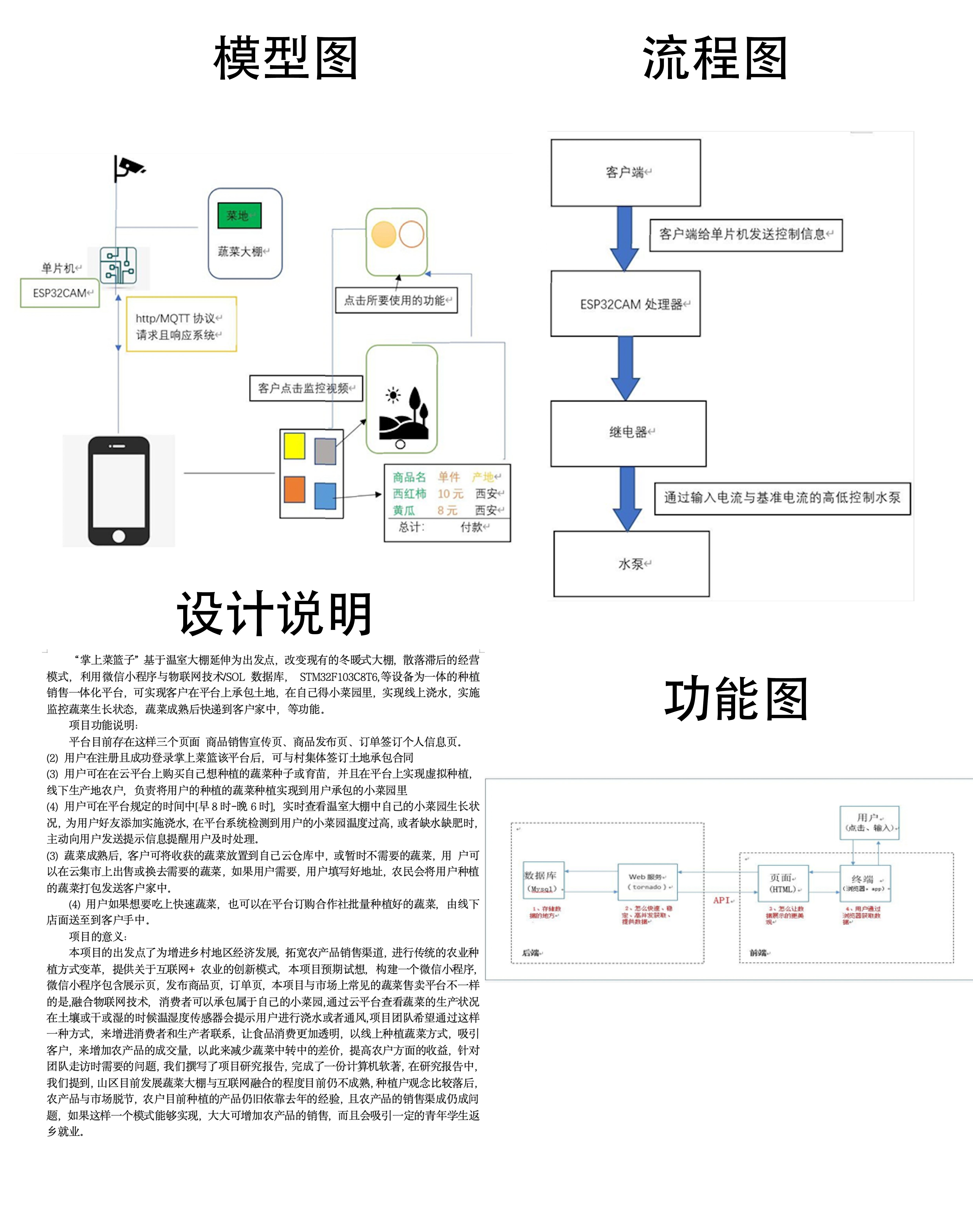 本项目介绍了一种基于微信小程序与物联网融合在蔬菜大棚方面的创意想法,本项目的出发点了,为增进乡村地区经济发展,拓宽农产品销售渠道,进行传统的农业种植方式变革,提供关于互联网+ 农业的创新模式,消费者可以承包属于自己的小菜园,通过云平台查看蔬菜的生产状况在土壤或干或湿的时候温湿度传感器会提示用户进行浇水或者通风,项目团队希望通过这样一种方式,来增进消费者和生产者联系,让食品消费更加透明。