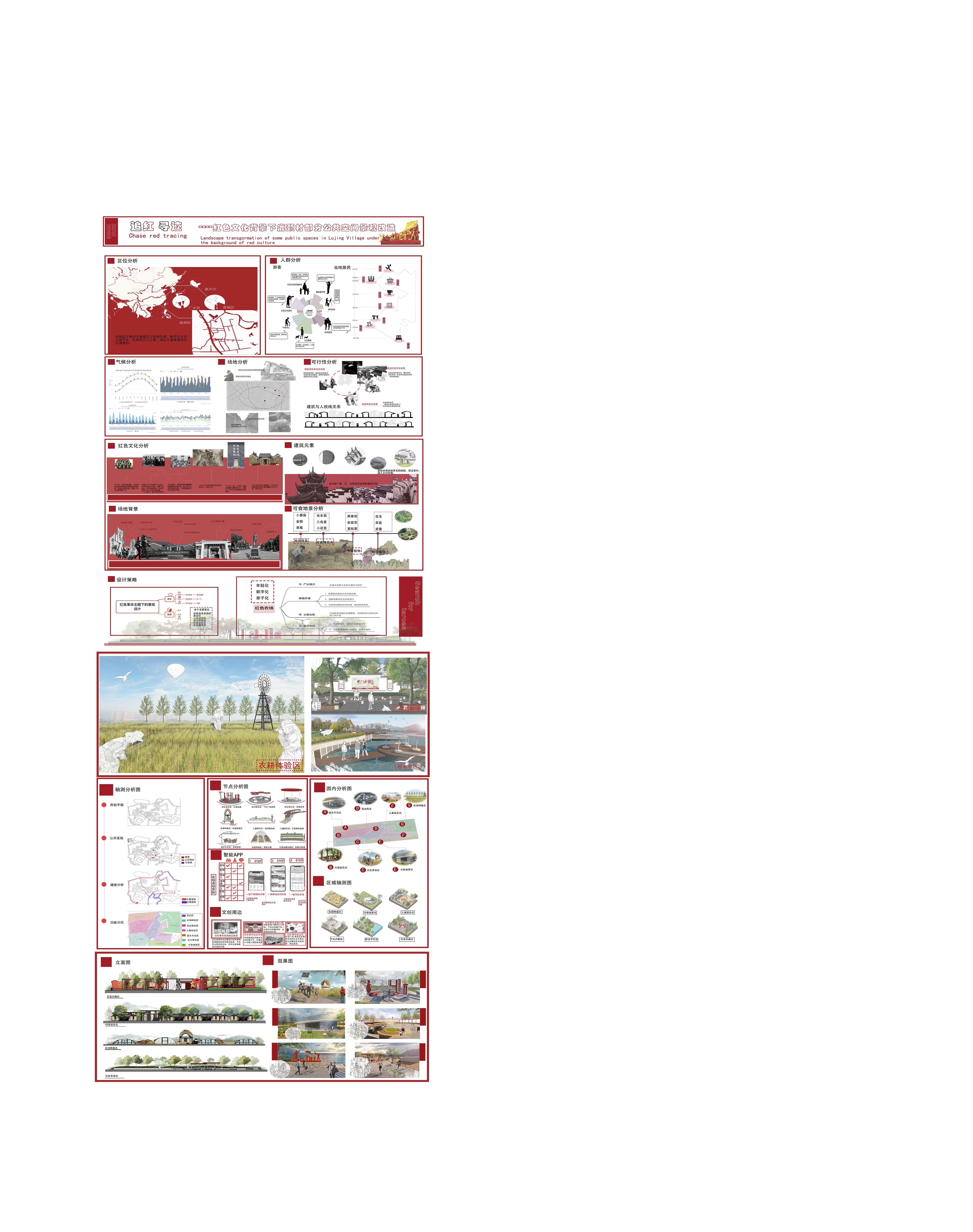 (1)场地:该设计位于惠州市惠城区,在红色革命人物邓演达的影响下,鹿颈村部分公共空间的景观改造。 (2)主题:追红 寻迹,利用红色文化,提高其知名度。 (3)植物:采用本地的乡土植物,乔灌草搭配,做到四季有叶,三季有花。