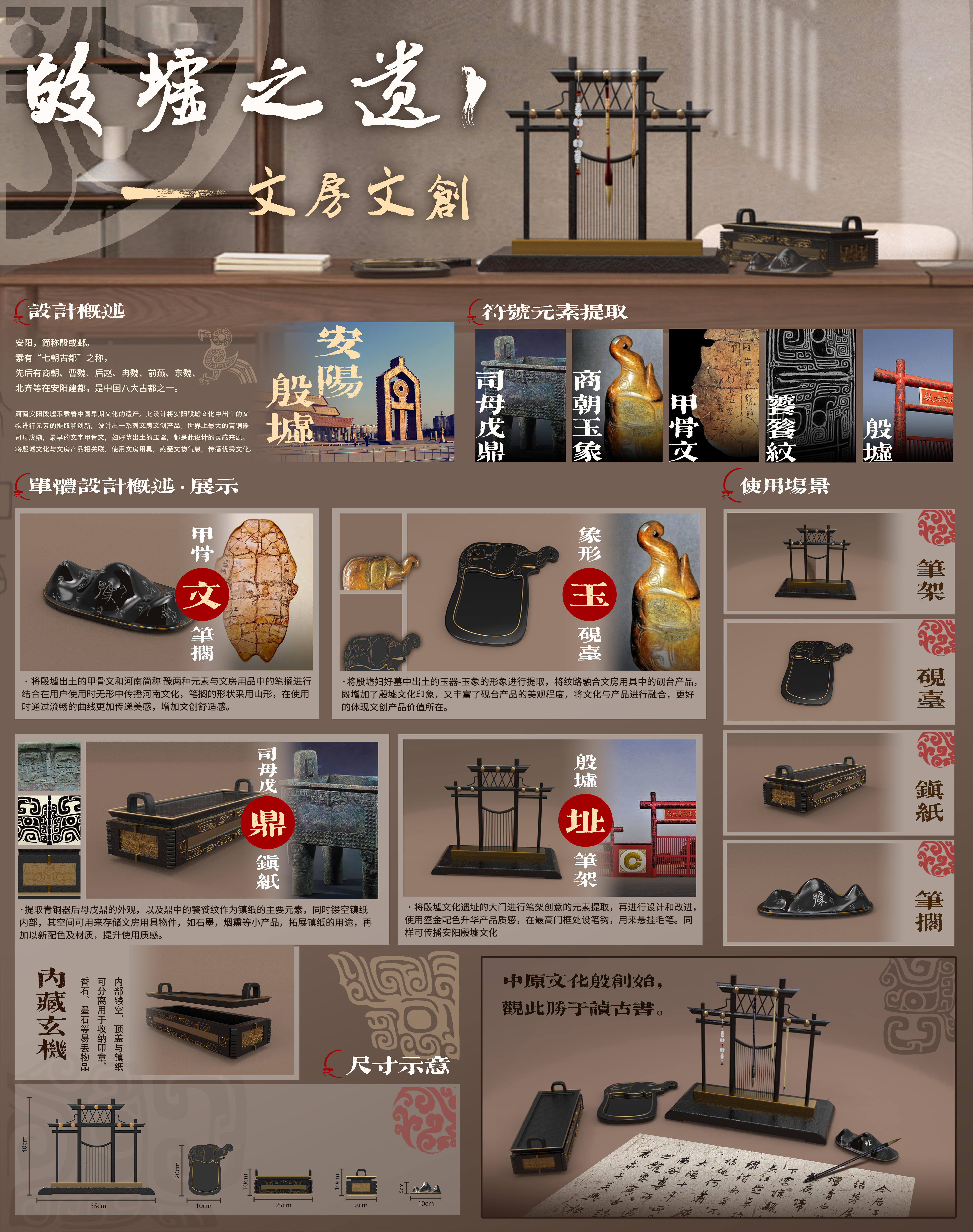 河南安阳殷墟承载着中国早期文化的遗产,此设计将安阳殷墟文化中出土的文物进行元素的提取和创新,设计出一系列文房文创产品。世界最大的青铜器司母戊鼎,最早的文字甲骨文,妇好墓出土的玉器,都是此设计的灵感来源。将殷墟文化与文房产品相关联,使用文房用具,感受文物气息,传播优秀文化。