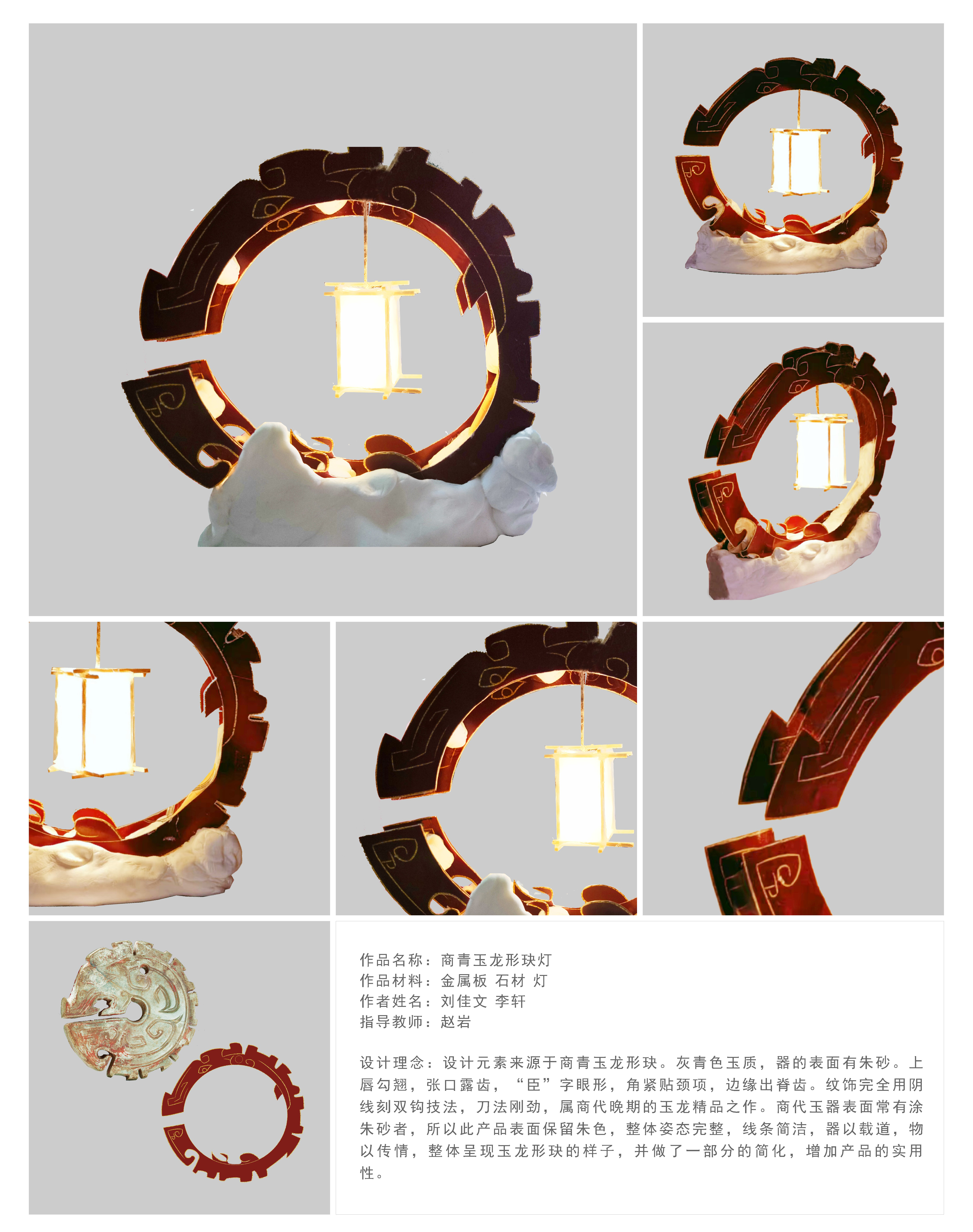 设计元素来源于商青玉龙形玦。灰青色玉质,器的表面有朱砂。上唇勾翘,张口露齿,“臣”字眼形,角紧贴颈项,边缘出脊齿。纹饰完全用阴线刻双钩技法,刀法刚劲,属商代晚期的玉龙精品之作。商代玉器表面常有涂朱砂者,所以此产品表面保留朱色,整体姿态完整,线条简洁,器以载道,物以传情,整体呈现玉龙形秋的样子,并做了一部分的简化,增加产品的实用性。