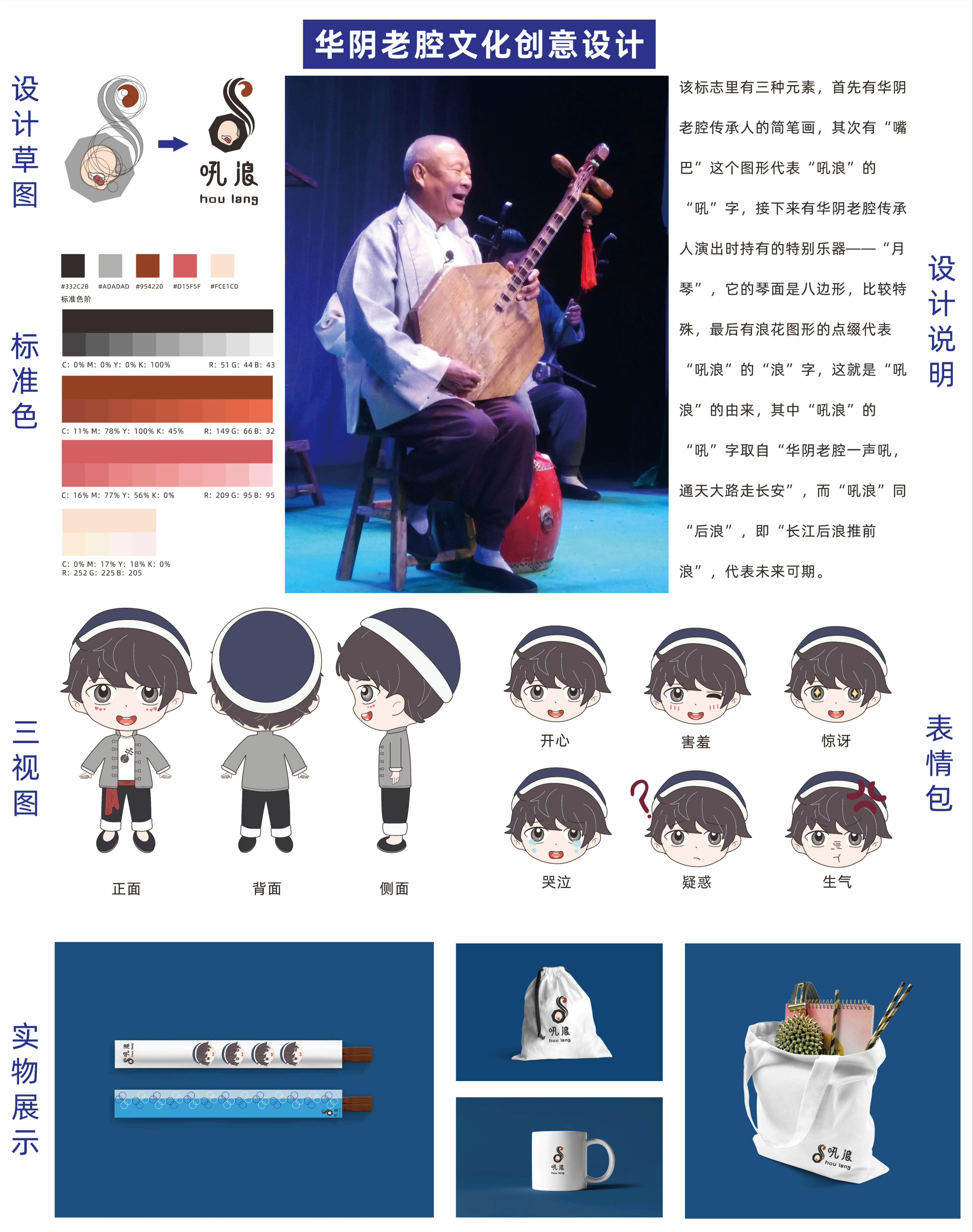 该作品以国家级非物质文化遗产之一的华阴老腔为灵感,把代表性传承人王振中的人物形象与演出时持有的特别乐器——“月琴”相结合,由此构成了标志设计,再以演出时常穿的服装及配色为原型,设计出了IP形象和六个不同表情,最后生成实物进行展示完成整幅作品。