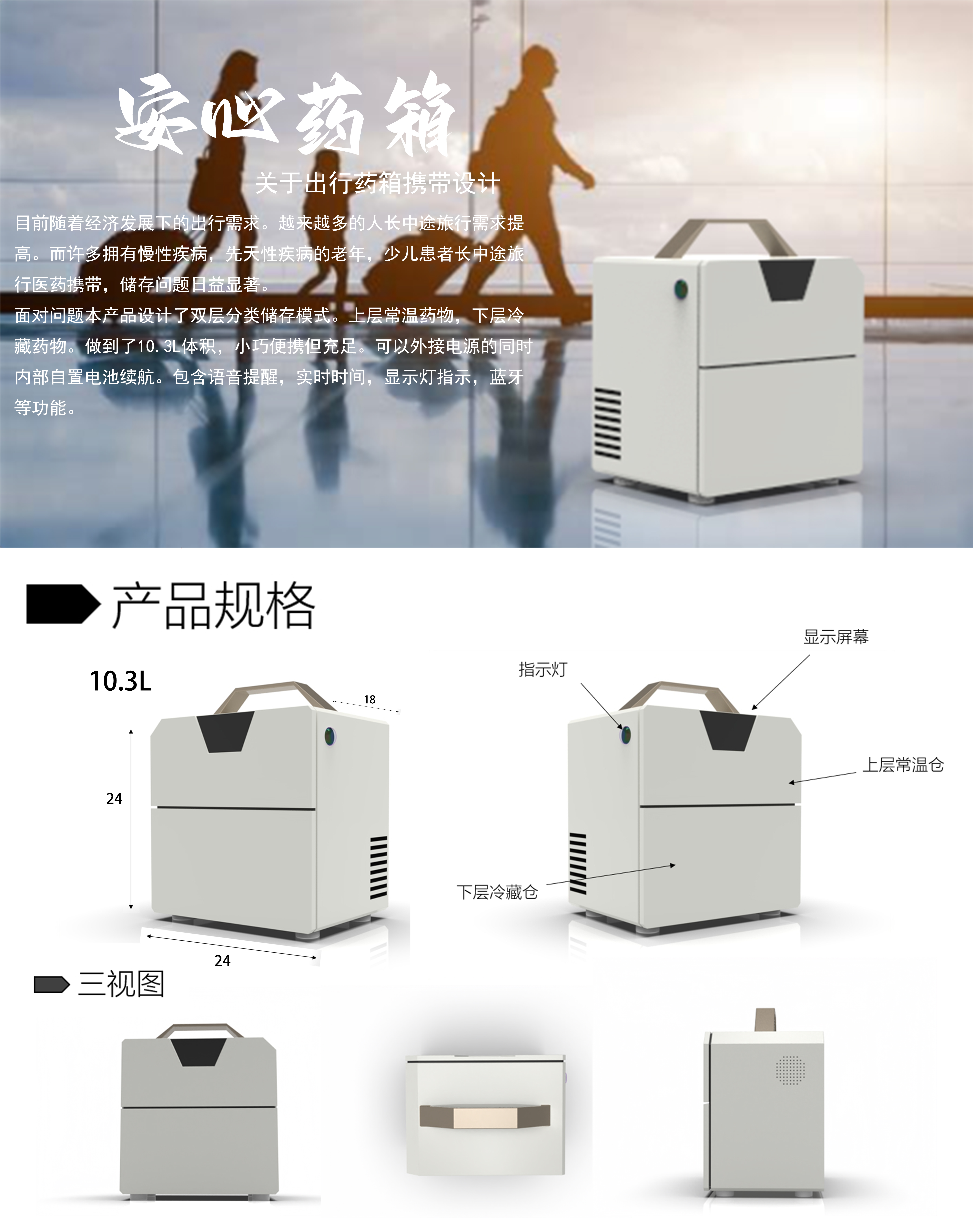 目前随着经济发展下的出行需求。越来越多的人长中途旅行需求提高。而许多患者长中途旅行医药携带,储存问题日益显著。面对中长途外出需求,而药物携带箱得兼具多样化,智能化,可冷藏。本产品面对问题设计了双层分类储存模式。上层常温药物,下层冷藏药物。做到了10L体积,小巧便携但充足。可以外接电源的同时内部自置电池续航。包含语音提醒,实时时间,显示灯指示,外接蓝牙等功能,解决用户需求。
