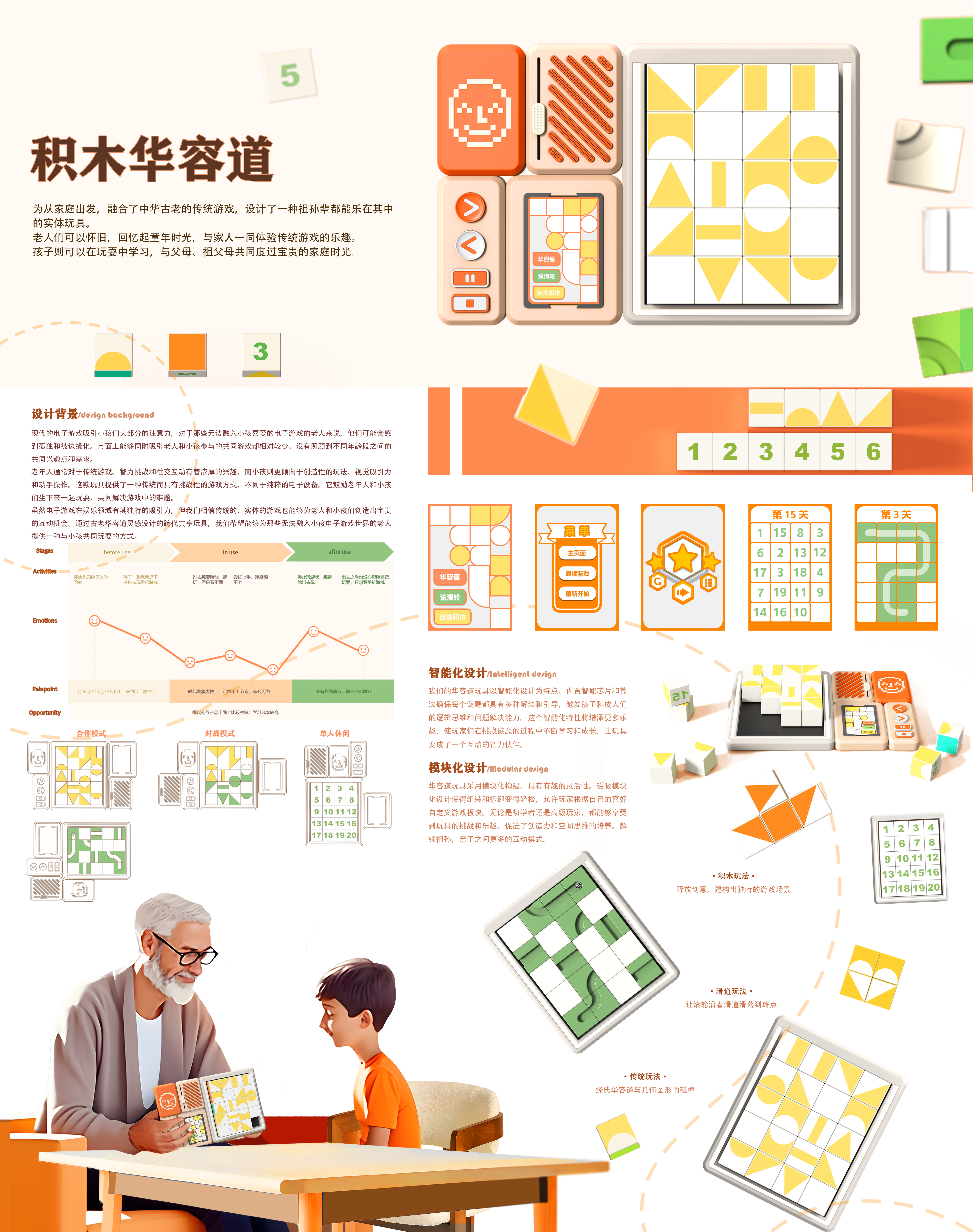 现代的电子游戏吸引小孩们大部分的注意力,对于那些无法融入小孩喜爱的电子游戏的老人来说,他们可能会感到孤独和被边缘化。我们相信传统的、实体的游戏也能够为老人和小孩们创造出宝贵的互动机会。通过古老华容道灵感设计的跨代家庭玩具,我们希望能够为那些无法融入小孩电子游戏世界的老人提供一种与小孩共同玩耍的场景。
