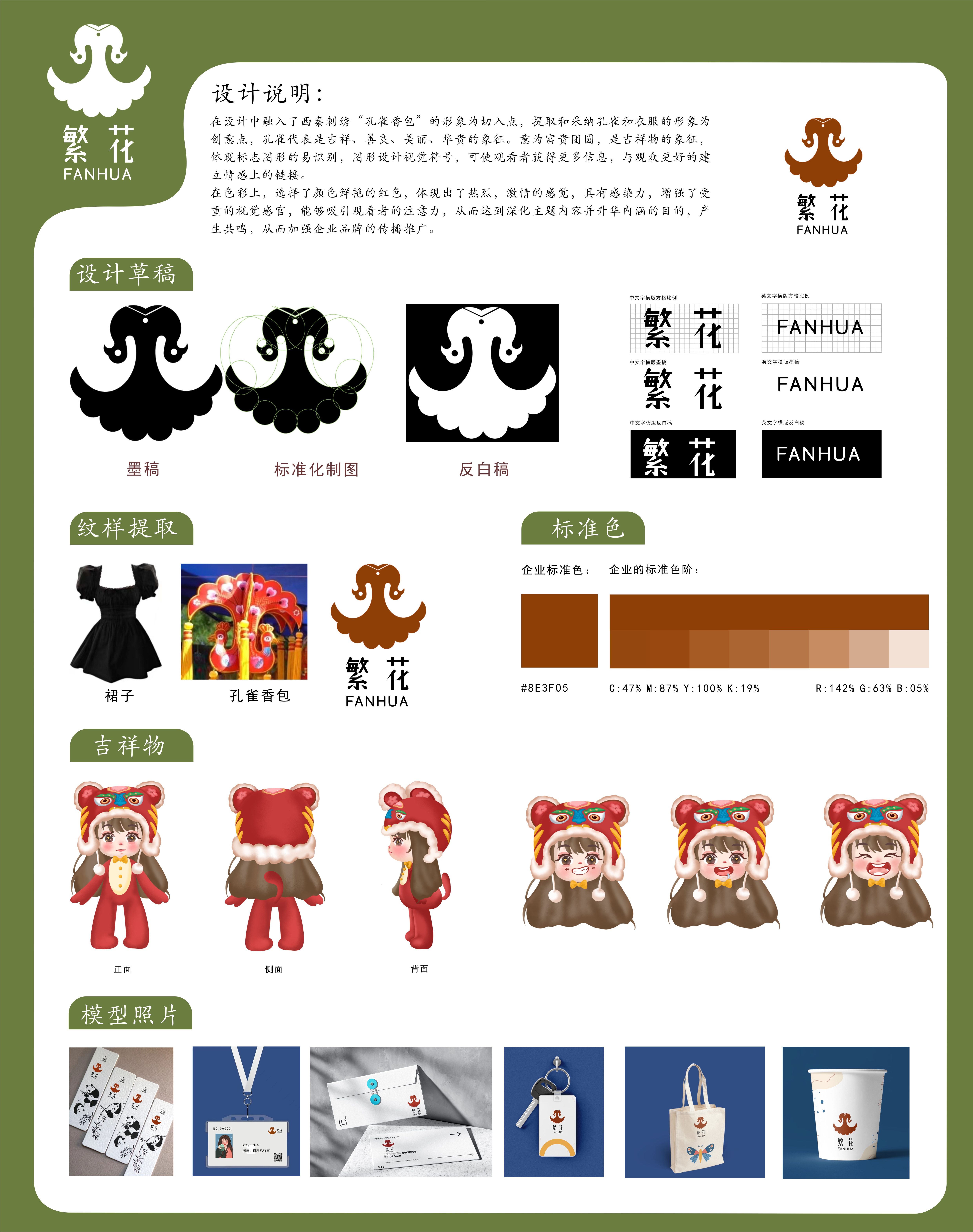 此设计融入了西秦刺绣“孔雀香包”的形象,提取和采纳孔雀和衣服的形象为创意点,孔雀代表是吉祥、善良、美丽、华贵的象征。为富贵团圆,是吉祥物的象征,体现标志图形的易识别,图形设计视觉符号,可使观看者获得更多信息,与观众更好的建立情感上的链接。在色彩上,选择了颜色鲜艳的红色,体现出了热烈,激情的感觉,具有感染力,增强了视觉冲击,吸引观看者的注意力,从而达到深化主题,产生共鸣,加强企业品牌的传播与推广。