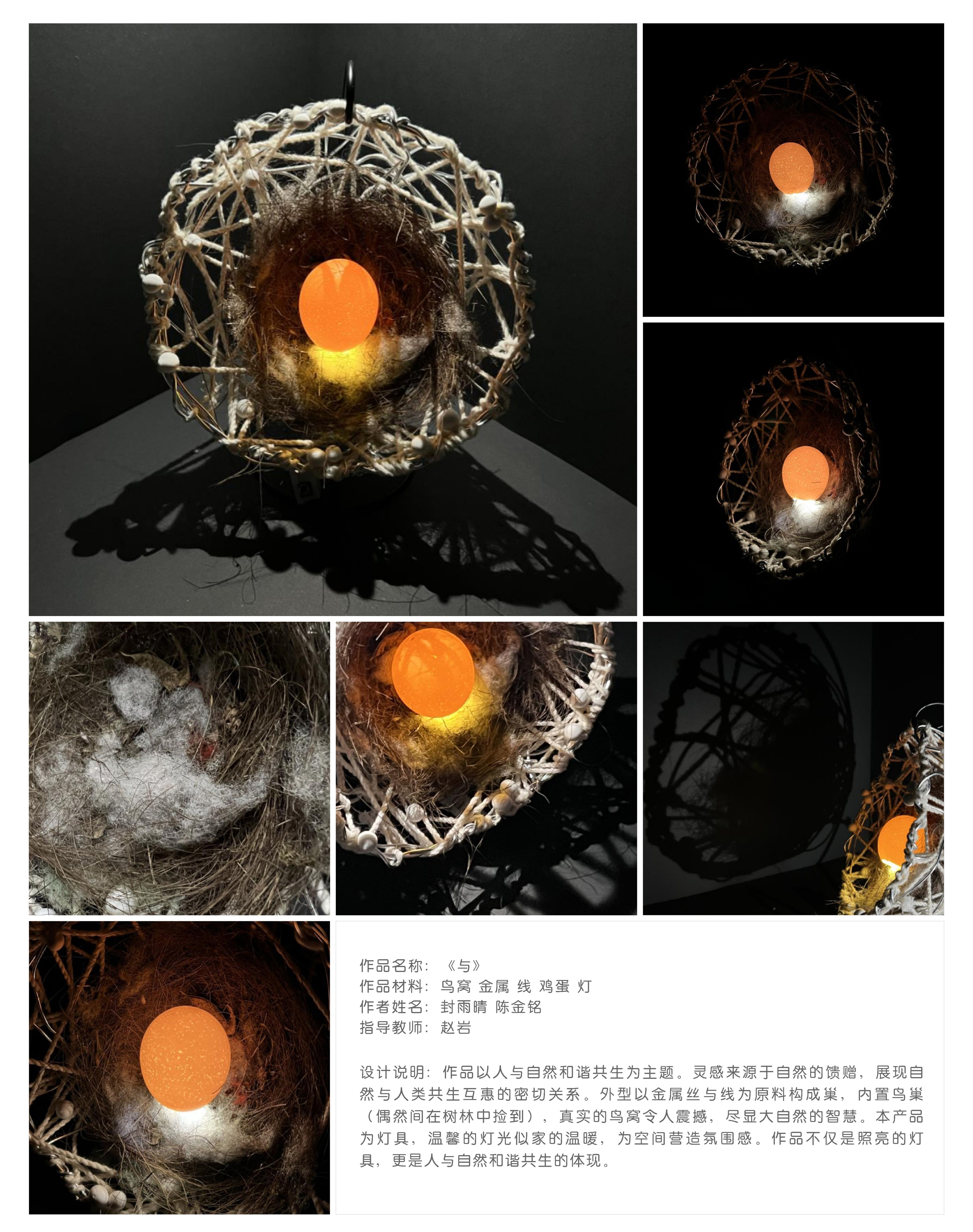 作品以人与自然和谐共生为主题。灵感来源于自然的馈赠,展现自然与人类共生互惠的密切关系。外型以金属丝与线为原料构成巢,内置鸟巢(偶然间在树林中捡到),真实的鸟窝令人震撼,尽显大自然的智慧。本产品为灯具,温馨的灯光似家的温暖,为空间营造氛围感。作品不仅是照亮的灯具,更是人与自然和谐共生的体现。