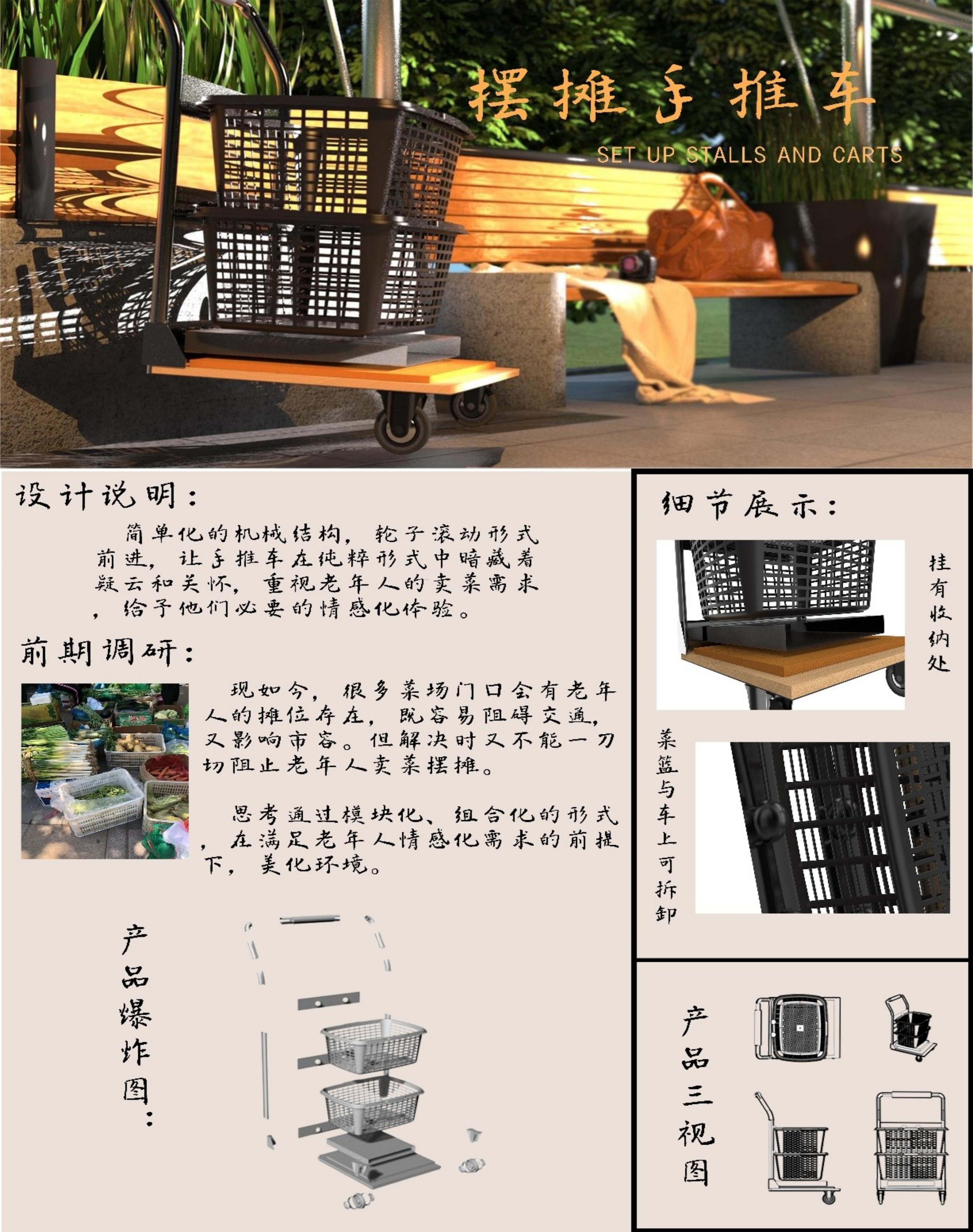 简单化的机械结构,轮子通过滚动形式前进,各个部件均可折叠收纳,让手推车在纯粹形式中暗藏着关怀。 该产品重视老年人的摆摊卖菜需求,给予他们必要的情感化体验。