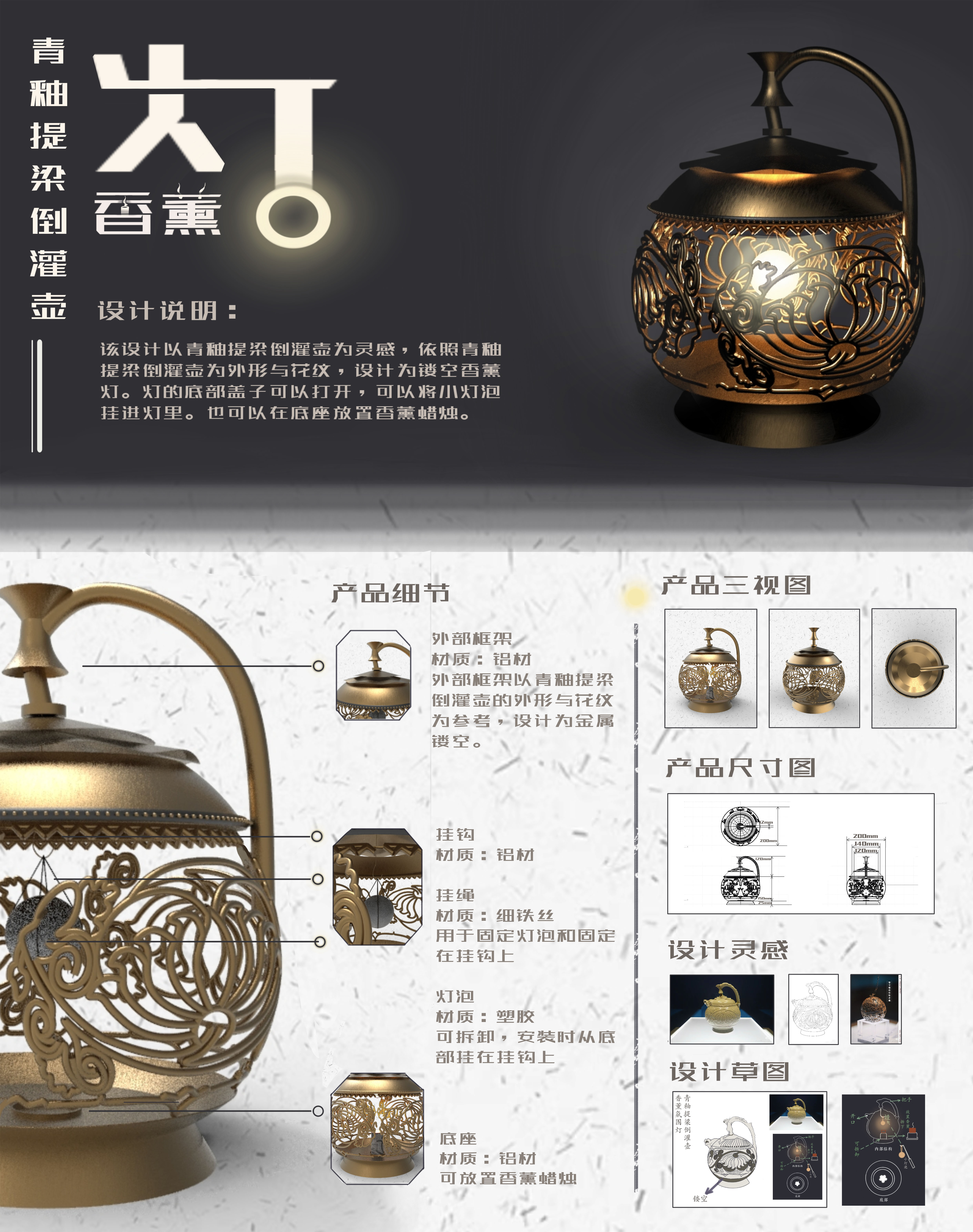 该设计以青釉提梁倒灌壶为灵感,依照青釉提梁倒灌壶为外形与花纹,设计为镂空香薰灯。灯的底部盖子可以打开,可以将小灯泡挂进灯里。也可以在底座放置香薰蜡烛。
