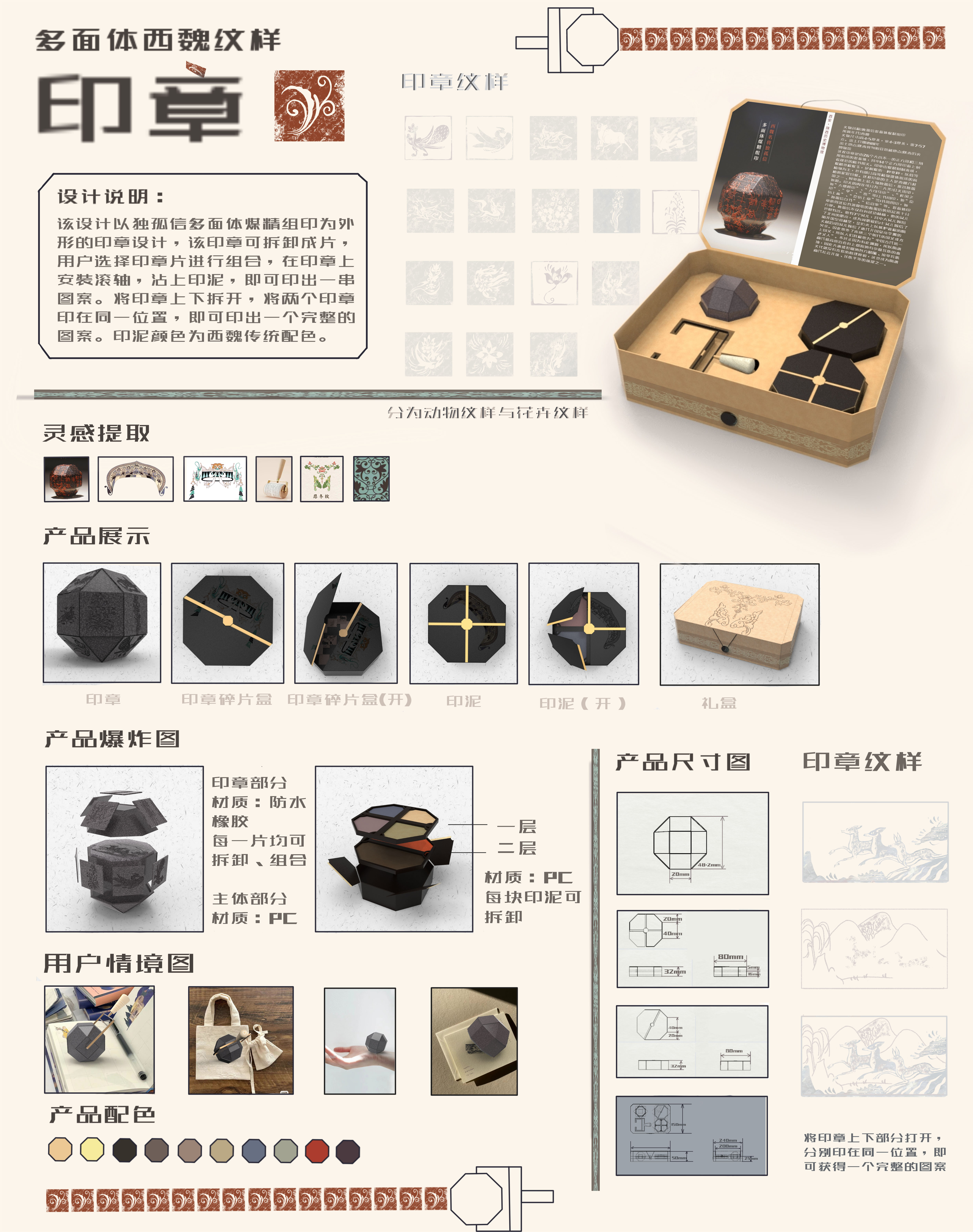 该设计以独孤信多面体煤精组印为外形的印章设计,该印章可拆卸成片,用户选择印章片进行组合,该产品赠送空白印章碎片,用于可以自行雕刻。在印章上安装滚轴,沾上印泥,即可印出一串图案。将印章上下拆开,将两个印章印在同一位置,即可印出一个完整的图案。印泥颜色为西魏传统配色。