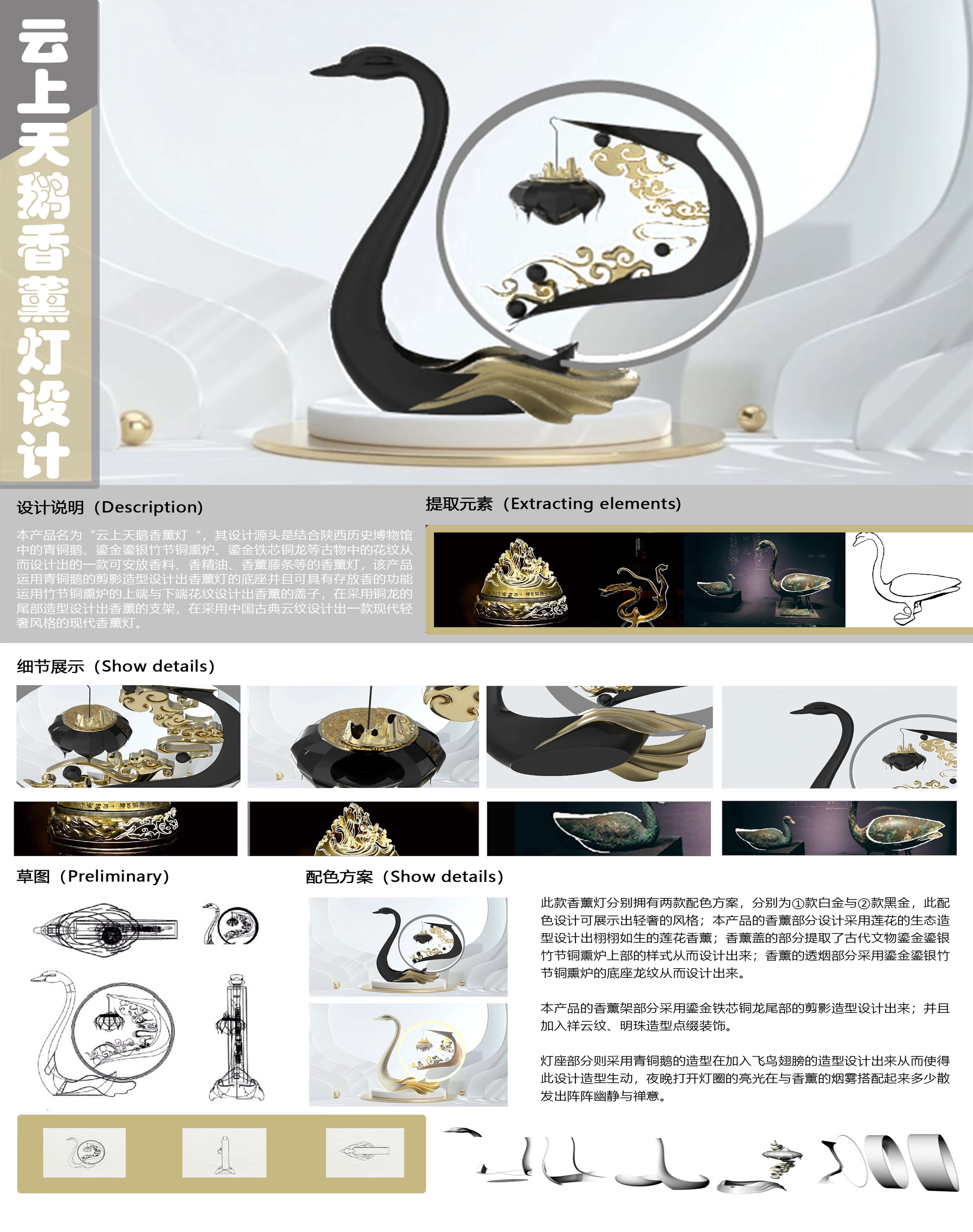 本产品名为 “云上天鹅香薰灯 “,其设计源头是结合陕西历史博物馆中的青铜鹅、鎏金鎏银竹节铜重炉.鎏金铁芯铜龙等古物中的花纹从而设计出的一款可安放香料、香精油、香黄藤条等的香薰灯,该产品运用查铜鹅的剪影造型设计出香黄灯的底座并目可具有存放香的功能运用价节铜雨炉的上端与下端花纹设计出香華的盖子,在采用铜龙的尾部造型设计出香藥的支架,在采用中国古典云纹设计出一款现代轻奢风格的现代香薰灯。