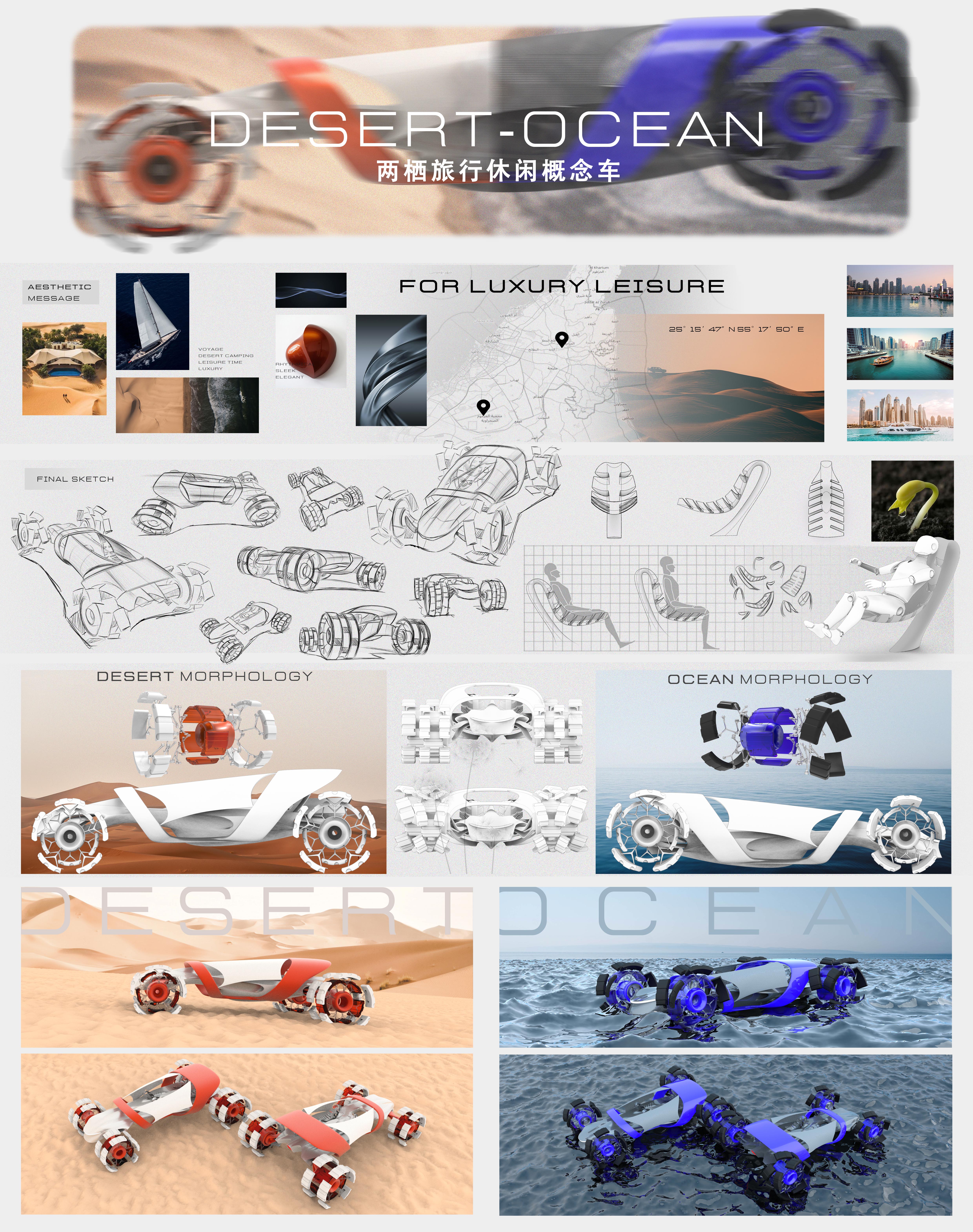 该车辆是一款基于未来技术的两栖豪华概念车,为沙漠海洋休闲旅行提供可能性。车身整体线条流畅,形态如同神秘的生物;座舱采用半开放式设计,白色可变形布料用于防风遮阳,引导未来人们亲近感受自然;座椅为叶芽仿生结构,姿态角度可变换,贴合乘坐者背部曲线,符合人体工程学;车轮结构以蒲公英为灵感,可以根据地形环境变换形态,行驶于沙漠和海洋。