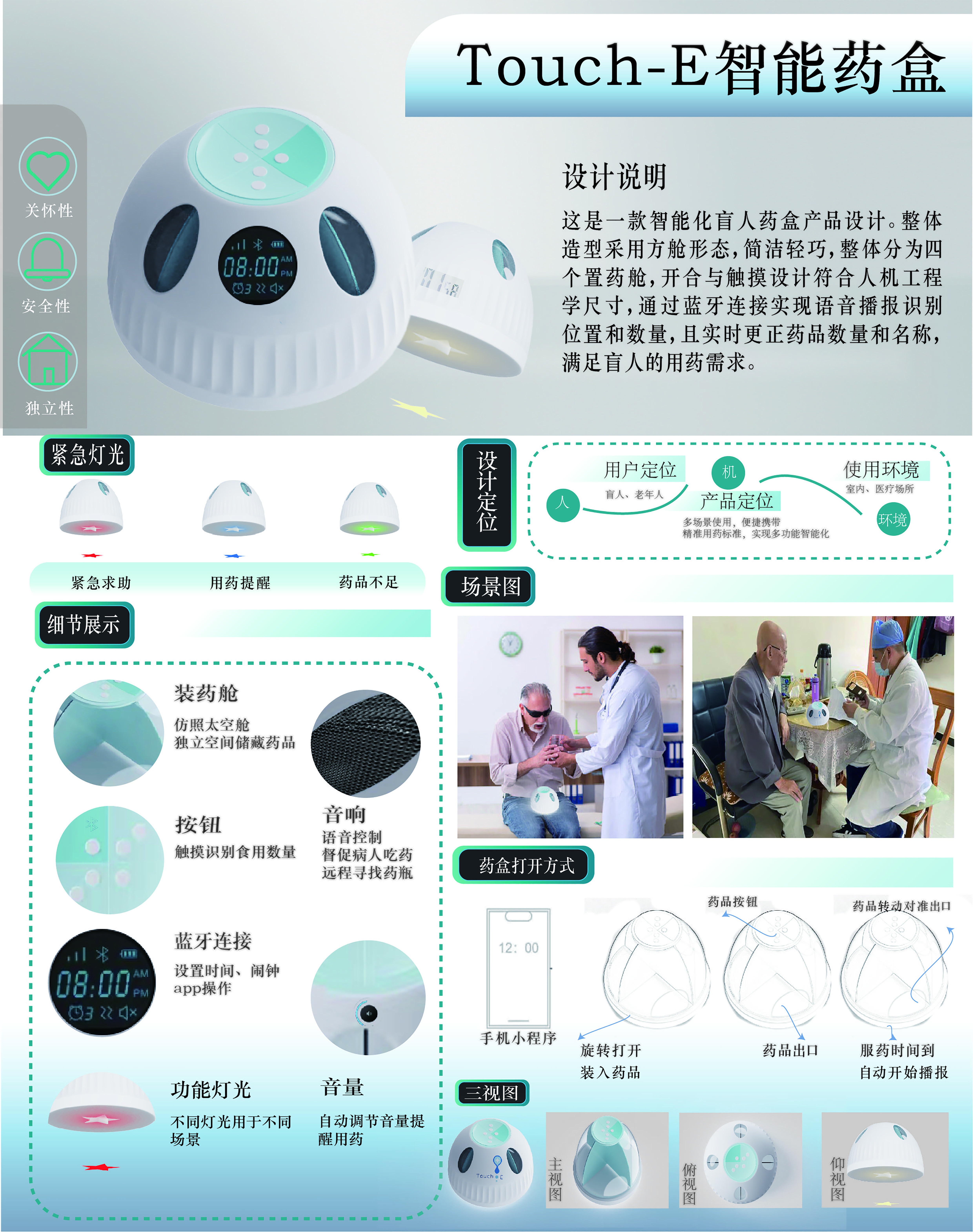 这是一款智能化盲人药盒产品设计。整体造型采用方舱形态,简洁轻巧,整体分为四个置药舱,开合与触摸设计符合人机工程学尺寸,通过蓝牙连接实现语音播报识别位置和数量,且实时更正药品数量和名称,满足盲人的用药需求。
