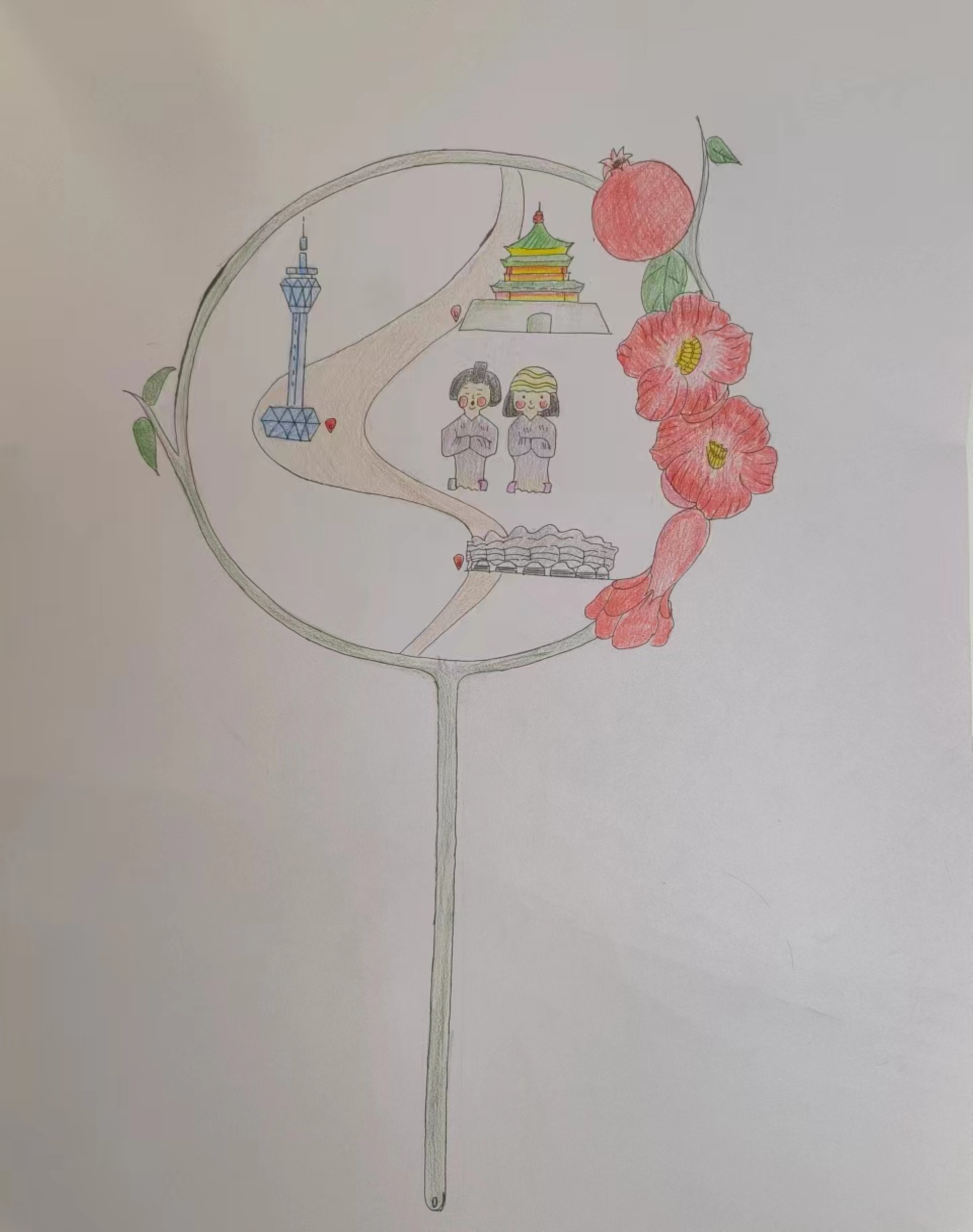 外围由石榴花围成的石榴花是西安的市花。 其也代表了西安独具特色的人文景观。文化底蕴 该作品的灵感是想将现代文化与古代文化相对比形成文化碰撞古今对比共筑了如今具有文化韵味的西安 长安亦西安