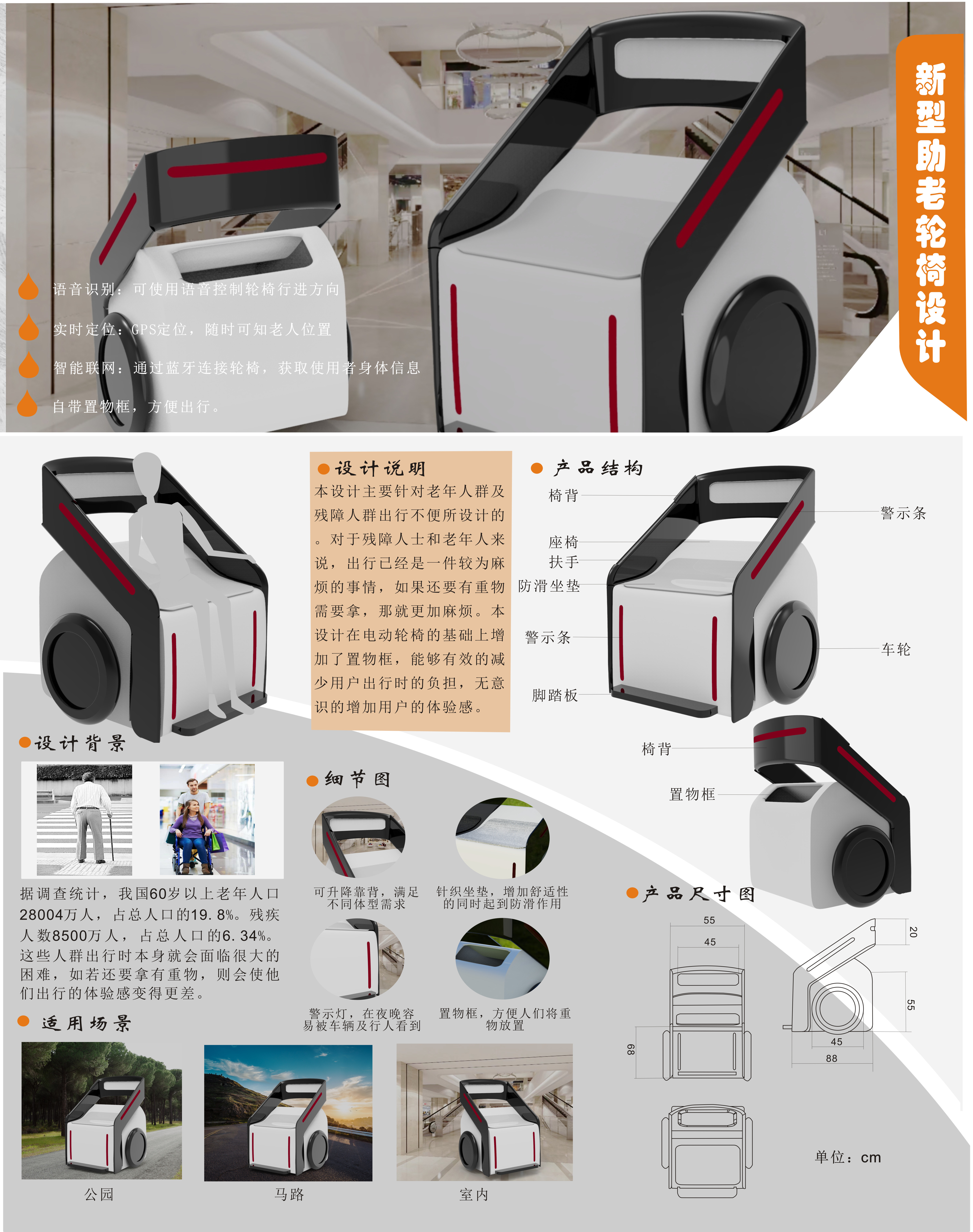 本设计主要针对老年人群及残障人群出行不便所设计的对于残障人士和老年人来说,出行已经是一件较为麻烦的事情,如果还要有重物需要拿,那就更加麻烦。本设计在电动轮椅的基础上增加了置物框,能够有效的减少用户出行时的负担,无意识的增加用户的体验感。