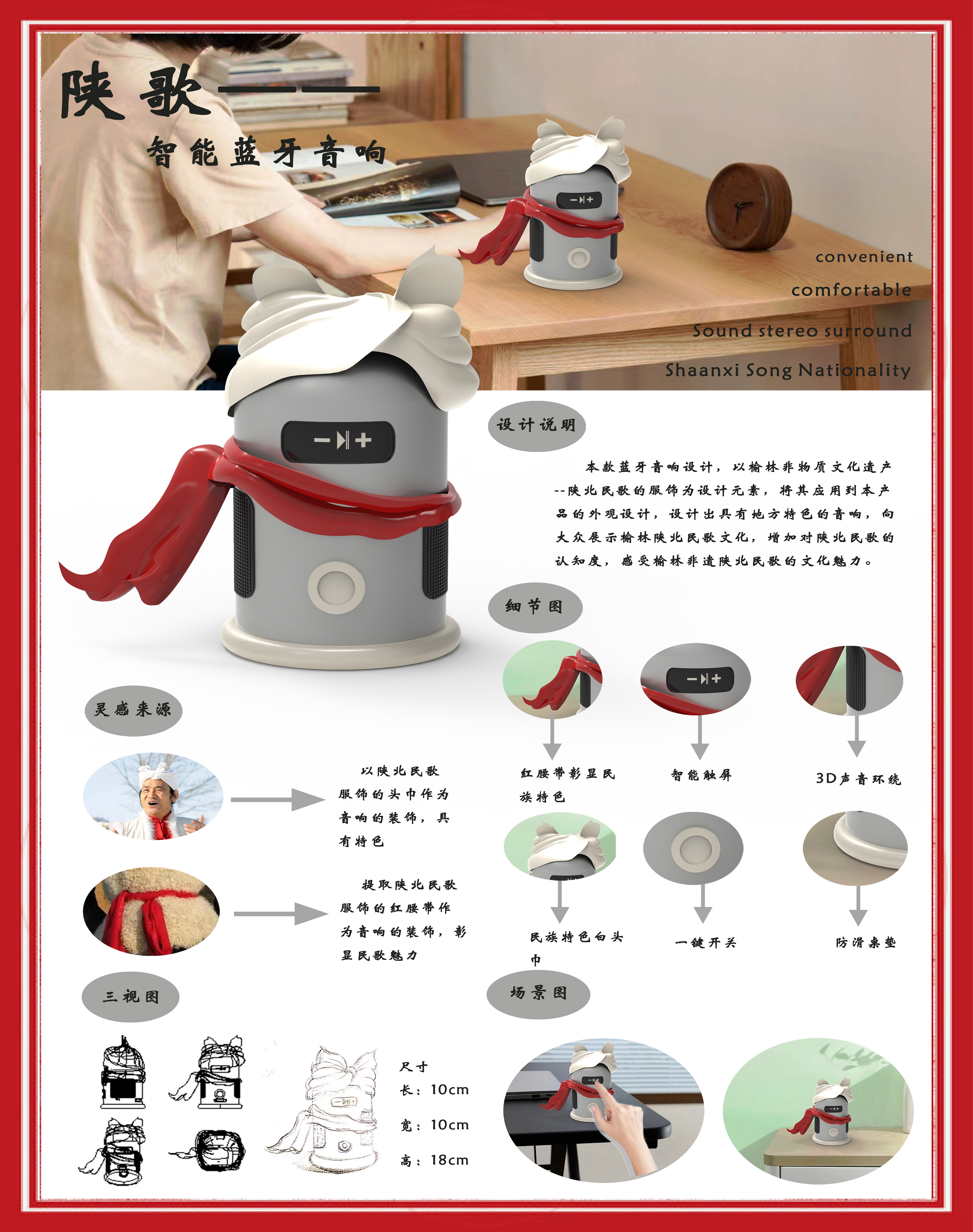 本款蓝牙音响设计,以榆林非物质文化遗产 --陕北民歌的服饰为设计元素,将其应用到本产品的外观设计,设计出具有地方特色的音响,向大众展示榆林陕北民歌文化,增加对陕北民歌的认知度,感受榆林非遗陕北民歌的文化魅力。