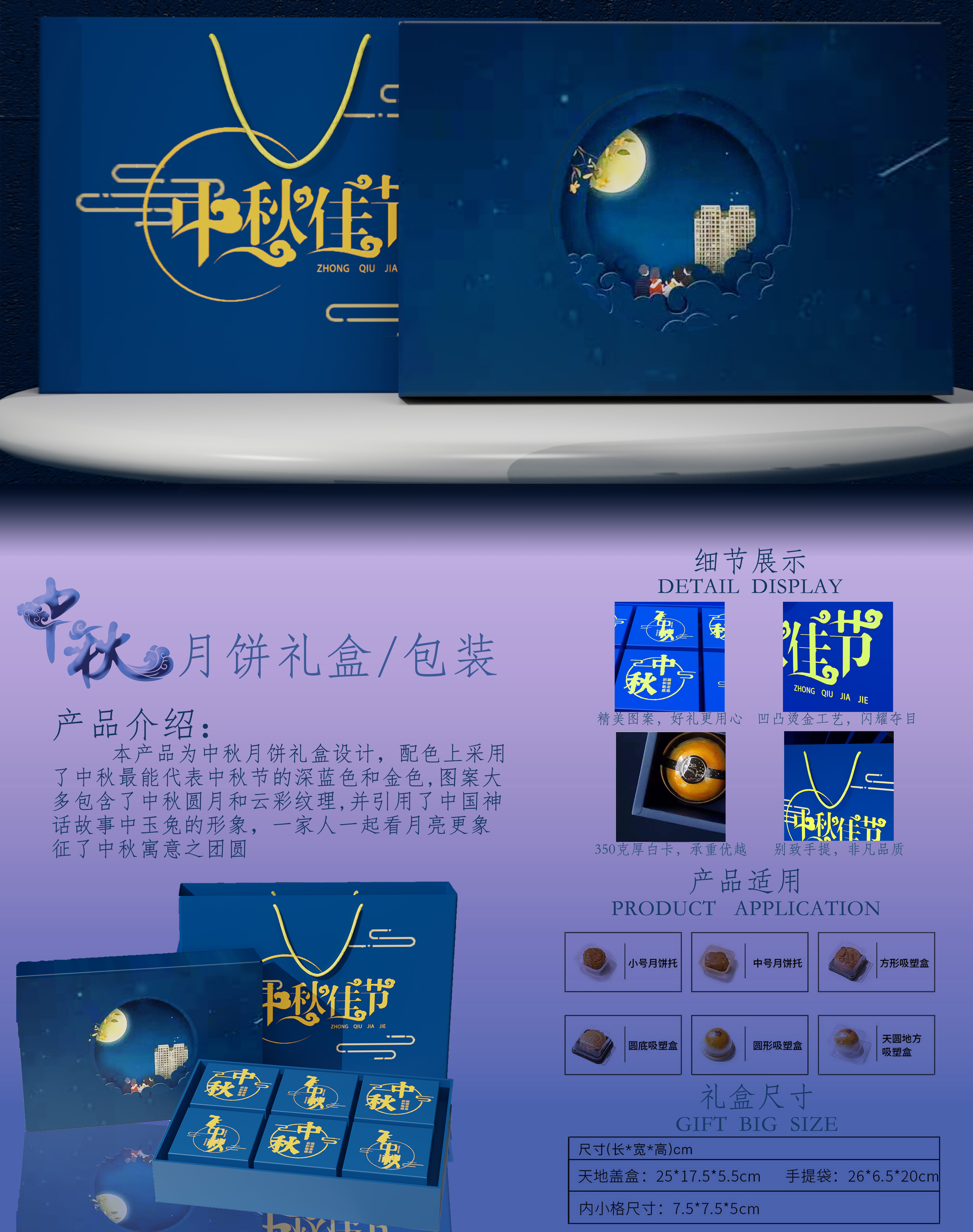 本产品为中秋月饼礼盒设计,配色上采用了中秋最能代表中秋节的深蓝色和金色,图案大多包含了中秋圆月和云彩纹理,并引用了中国神话故事中玉兔的形象,一家人一起看月亮更象征了中秋寓意之团圆。