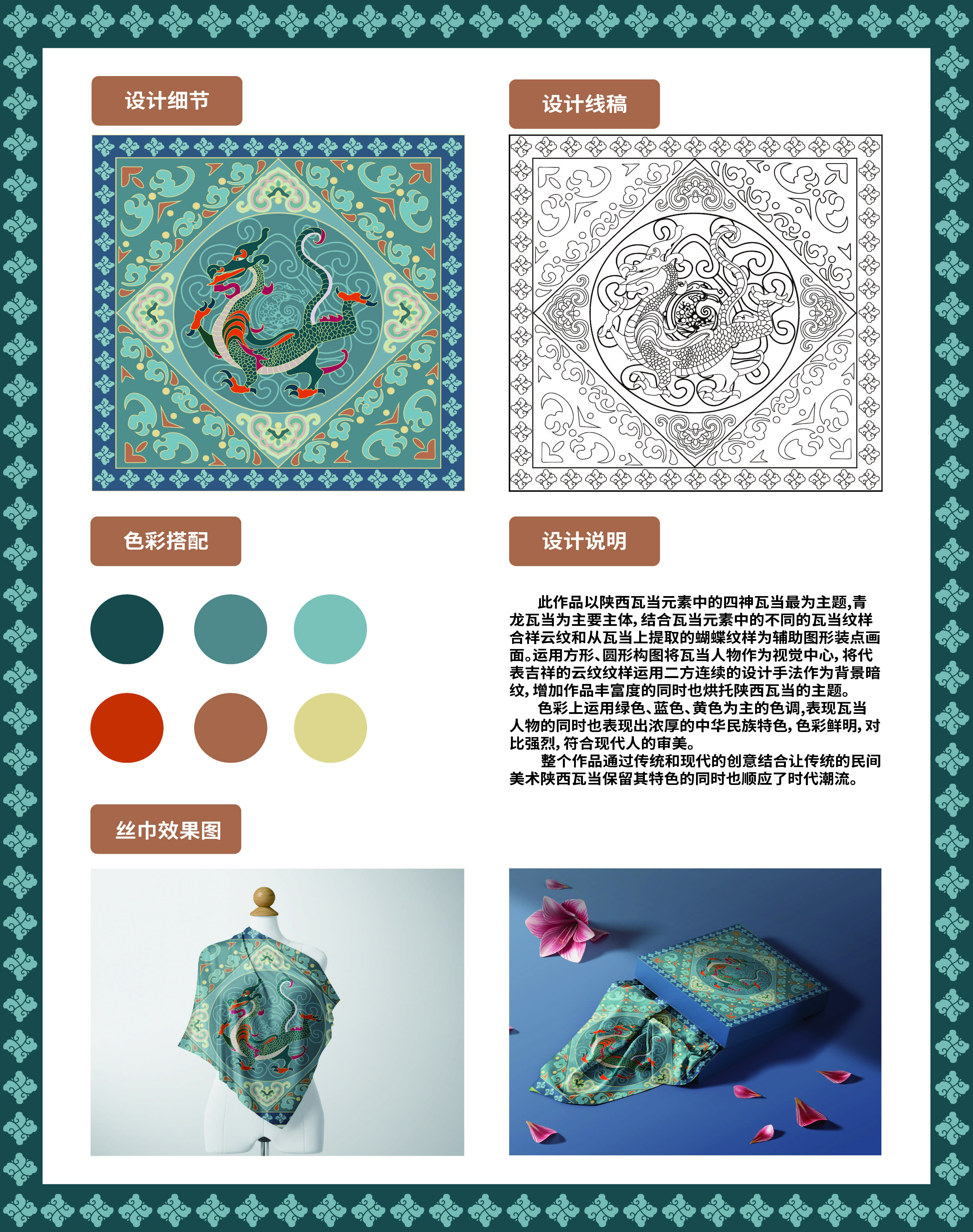 此作品以陕西青龙瓦当为主要主体,结合瓦当元素中的不同的瓦当纹样合祥云纹和从瓦当上提取的蝴蝶纹样为辅助图形装点画面。运用方形、圆形构图将瓦当人物作为视觉中心,将代表吉祥的云纹纹样运用二方连续的设计手法作为背景暗纹,增加作品丰富度的同时也烘托陕西瓦当的主题。 色彩上运用绿色、蓝色、黄色为主的色调,表现瓦当人物的同时也表现出浓厚的中华民族特色,色彩鲜明,对比强烈,符合现代人的审美。