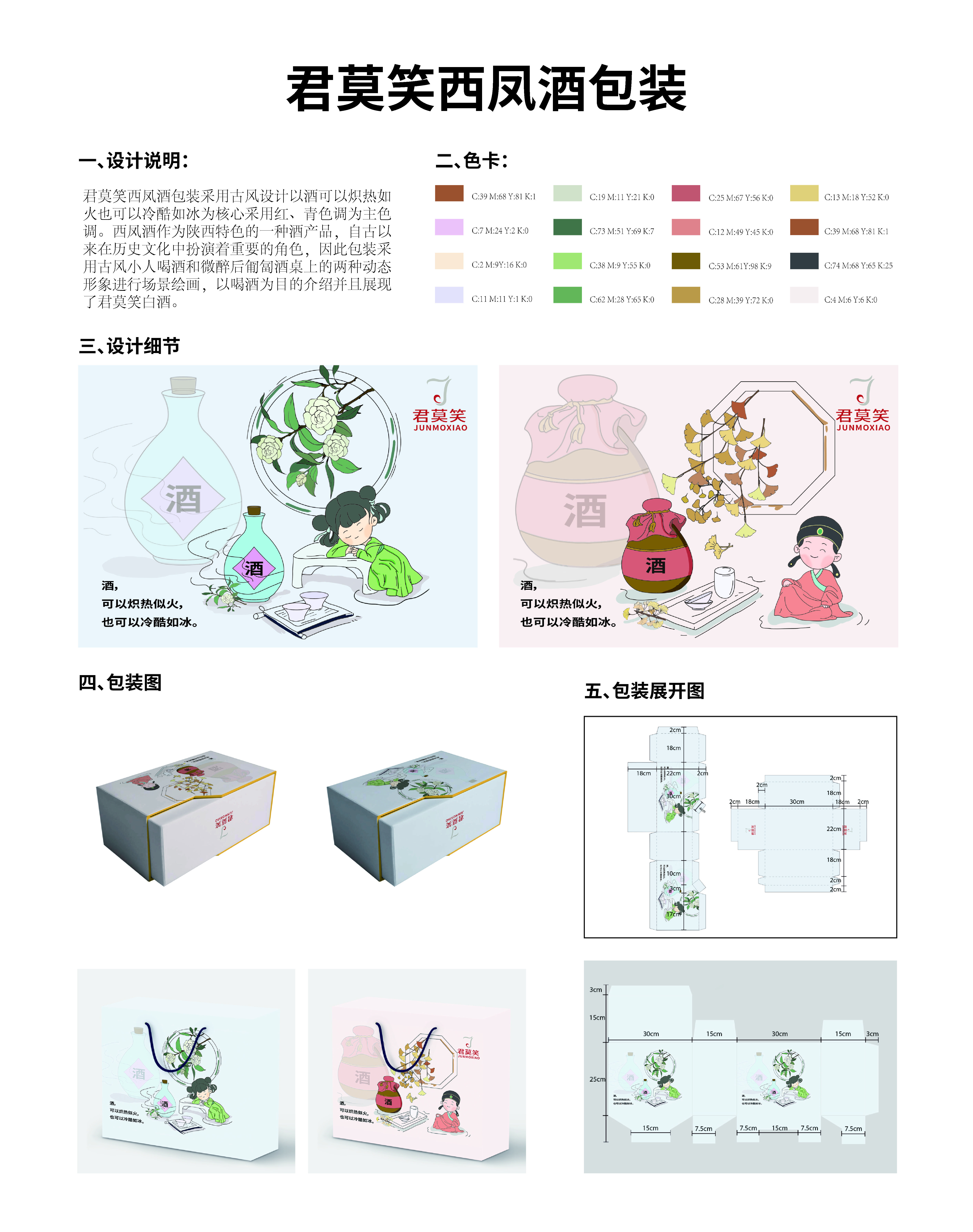 君莫笑西风酒包装采用古风设计以酒可以炽热如火也可以冷酷如冰为核心采用红、青色调为主色调。西凤酒作为陕西特色的一种酒产品,自古以来在历史文化中扮演着重要的角色,因此包装采用古风小人喝酒和微醉后徊匐酒桌上的两种动态形象进行场景绘画,以喝酒为目的介绍并且展现了君莫笑白酒。