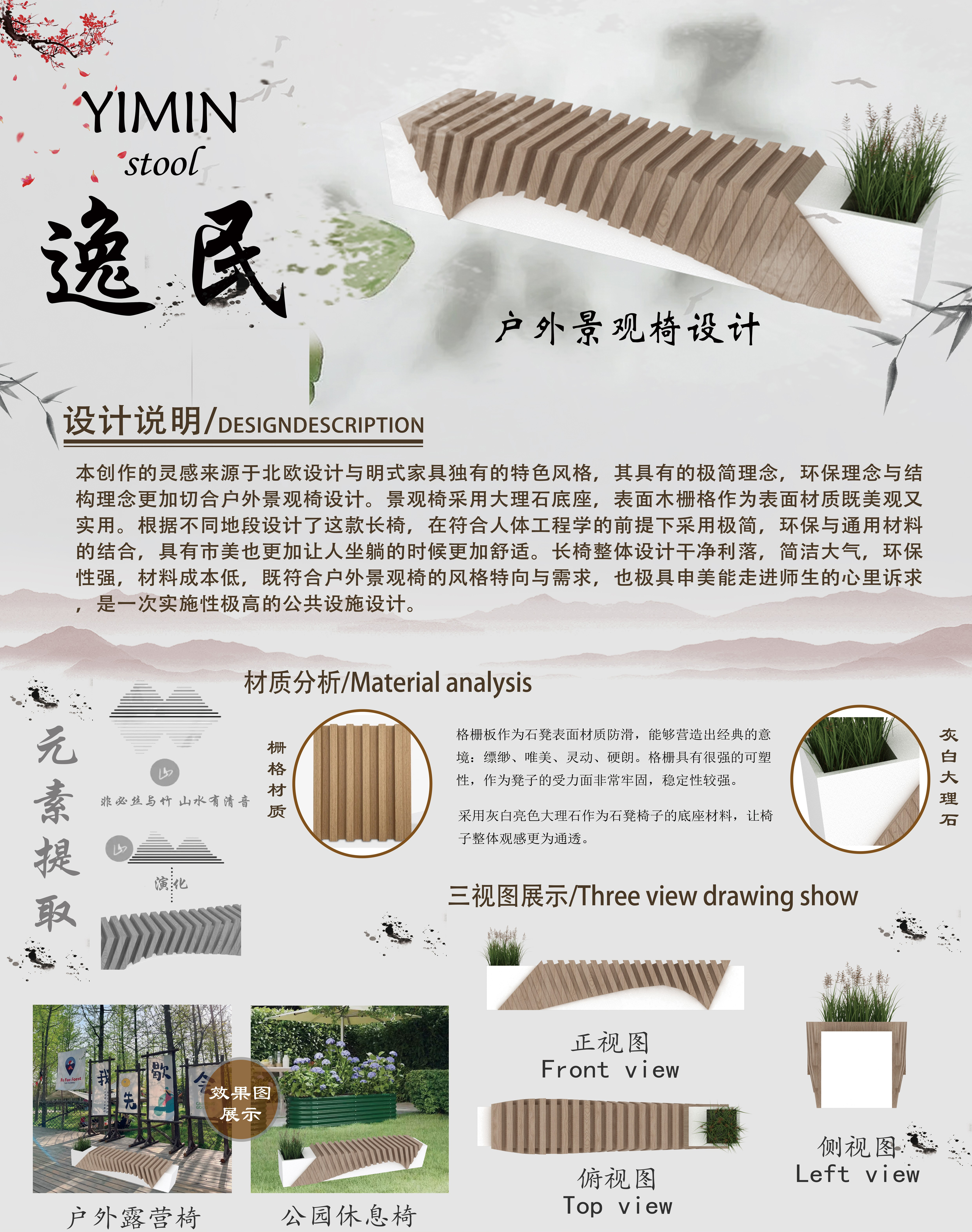本创作的灵感来源于北欧设计与明式家具独有的特色风格,具有的极简理念,环保理念与结构理念更加切合户外景观椅设计。景观椅采用大理石底座,表面木栅格作为表面材质既美观叉实用。在符合人体工程学的前提下采用极简,环保与通用材料的结合,具有市美也更加让人坐躺的时候更加舒适。长椅整体设计千净利落、环保性强、材料成本低,既符合户外景观椅的风格特向与需求,也能走进师生的心里诉求是一次实施性极高的公共设施设计。