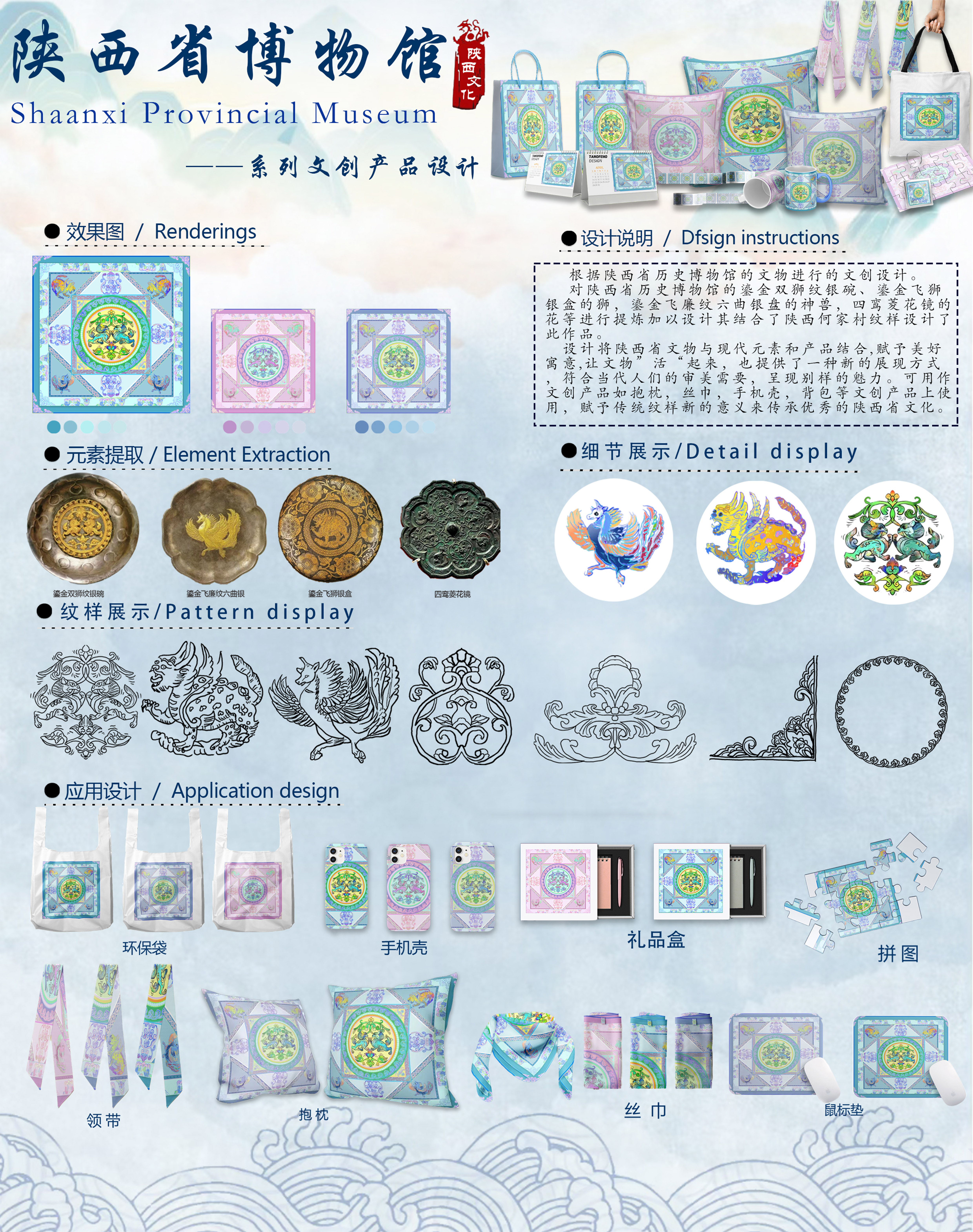 此作品对陕西省历史博物馆的鎏金双狮纹银碗、鎏金飞狮银盒的狮,鎏金飞廉纹六曲银盘的神兽,四鸾菱花镜的花等进行提炼加以设计其结合了陕西何家村纹样设计了此作品。设计将陕西省文物与现代元素和产品结合,赋予美好寓意,让文物”活“起来,也提供了一种新的展现方式符合当代人们的审美需要,呈现别样的魅力。可用作文创产品如抱枕,丝巾,手机壳,背包等文创产品上使用,赋予传统纹样新的意义来传承优秀的陕西省文化。