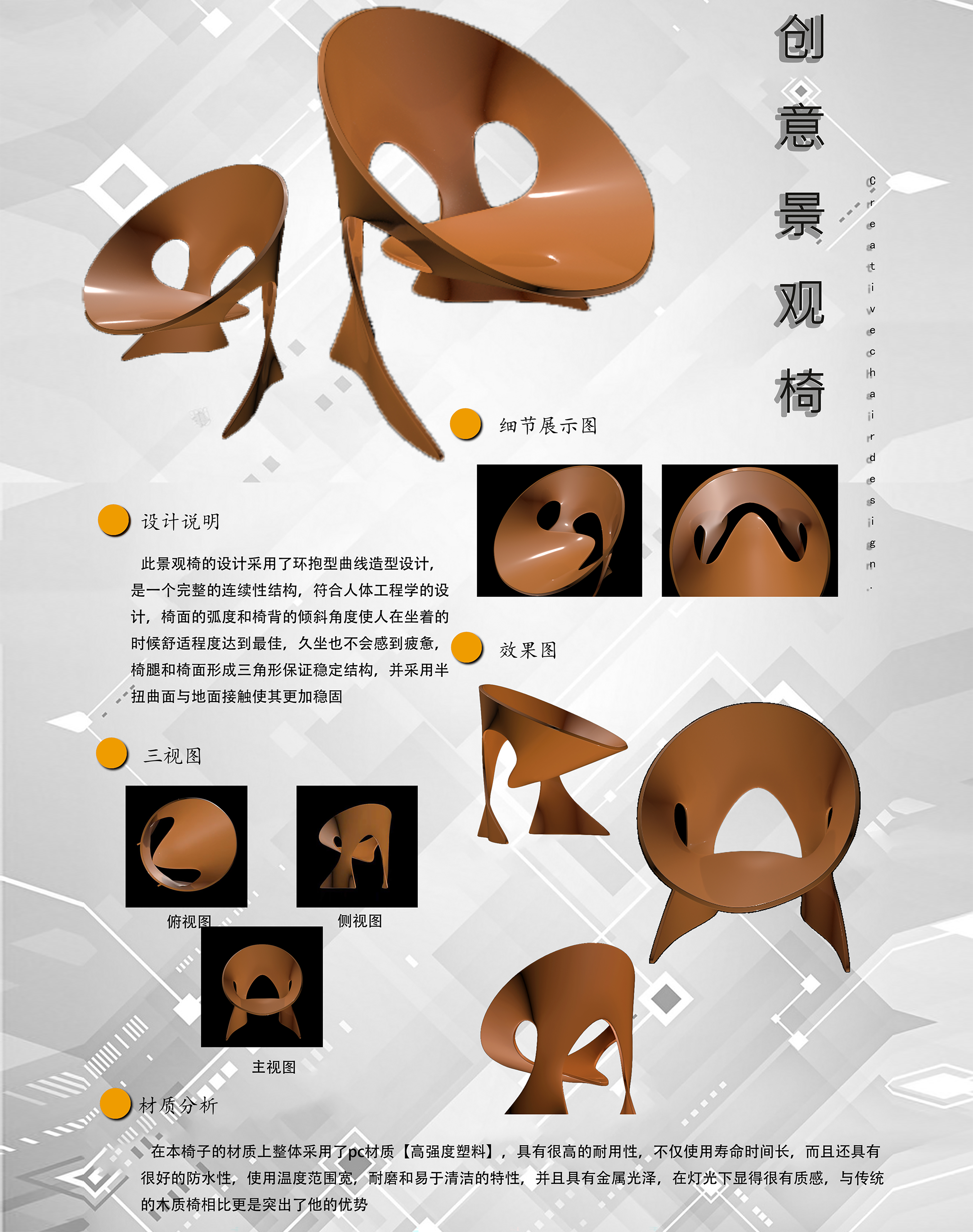 此景观椅的设计采用了环抱型曲线造型设计,是一个完整的连续性结构,符合人体工程学的设计,椅面的弧度和椅背的倾斜角度使人在坐着的时候舒适程度达到最佳,久坐也不会感到疲惫,椅腿和椅面形成三角形保证稳定结构,并采用半扭曲面与地面接触使其更加稳固