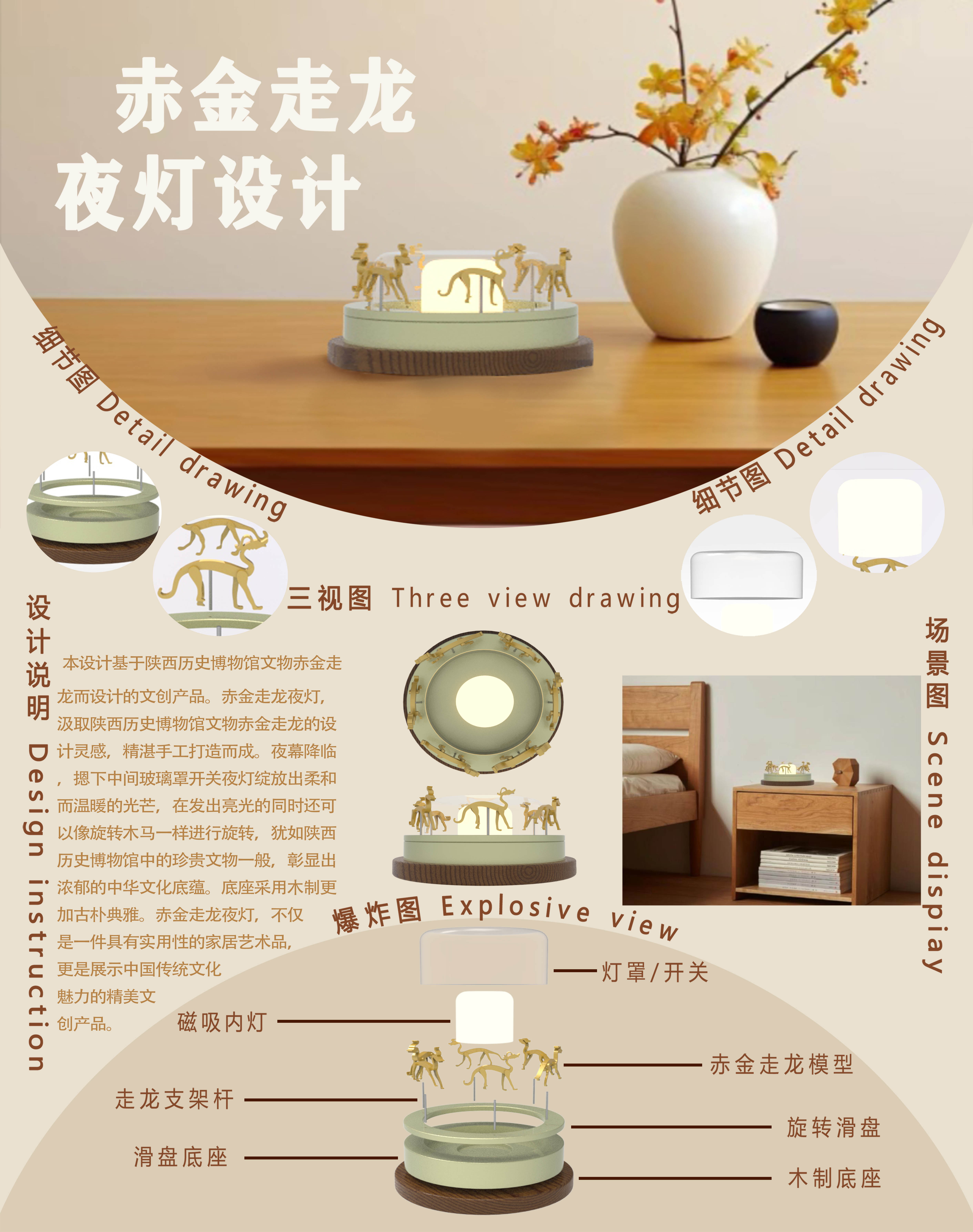 本设计基于陕西历史博物馆文物赤金走龙而设计的文创产品。赤金走龙夜灯,汲取陕西历史博物馆文物赤金走龙的设计灵感,精湛手工打造而成。夜幕降临,摁下中间玻璃罩开关夜灯绽放出柔和而温暖的光芒,在发出亮光的同时还可以像旋转木马一样进行旋转,如陕西历史博物馆中的珍贵文物一般,彰显出浓郁的文化底蕴。底座采用木制更加古朴典雅。赤金走龙夜灯,不仅是一件具有实用性的家居艺术品,更是展示中国传统文化魅力的文创产品。