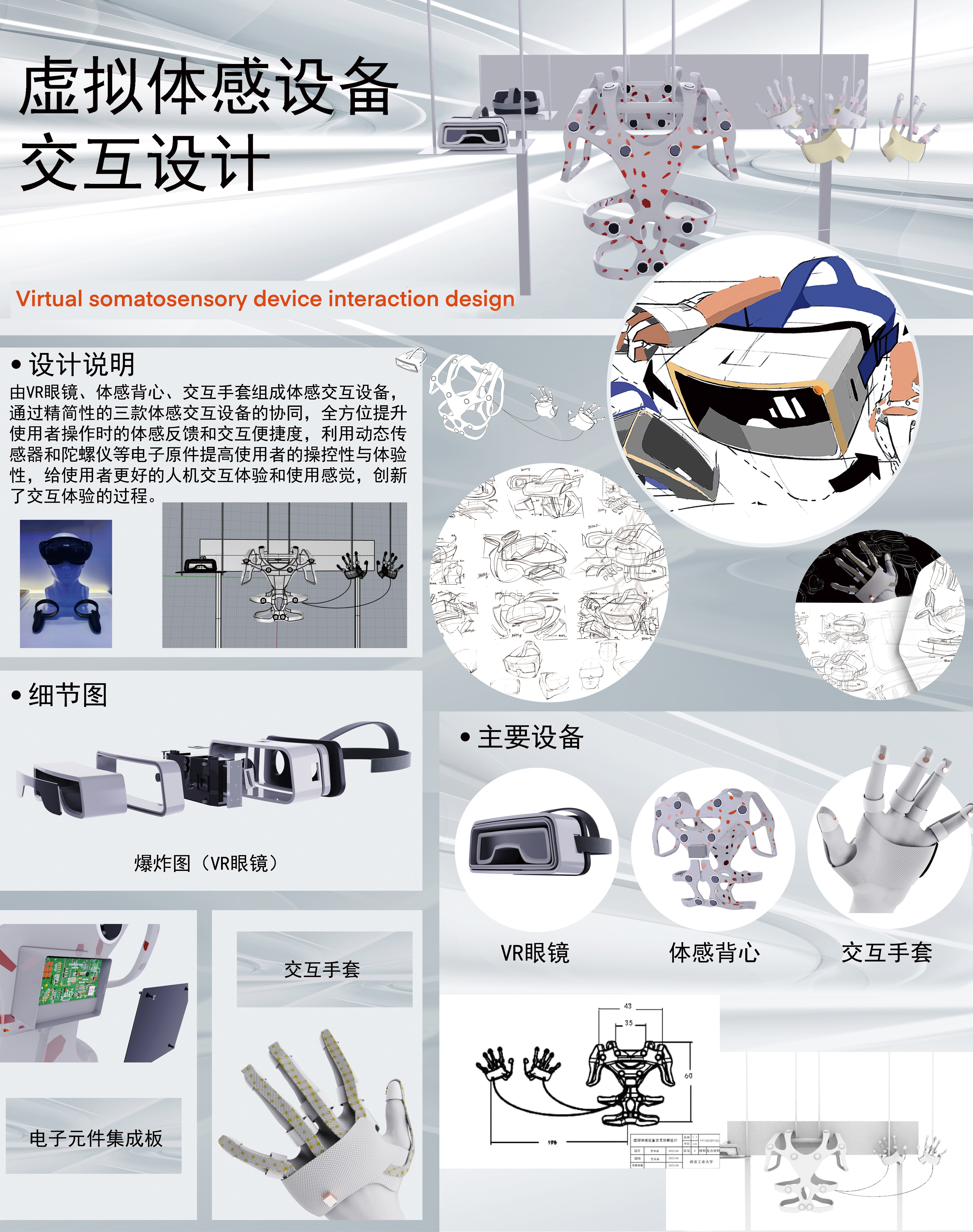 虚拟体感设备交互设计 由VR眼镜、体感背心、交互手套组成体感交互设备,通过精简性的三款体感交互设备的协同,全方位提升使用者操作时的体感反馈和交互便捷度,利用动态传感器和陀螺仪等电子原件提高使用者的操控性与体验性,给使用者更好的人机交互体验和使用感觉,创新了交互体验的过程。