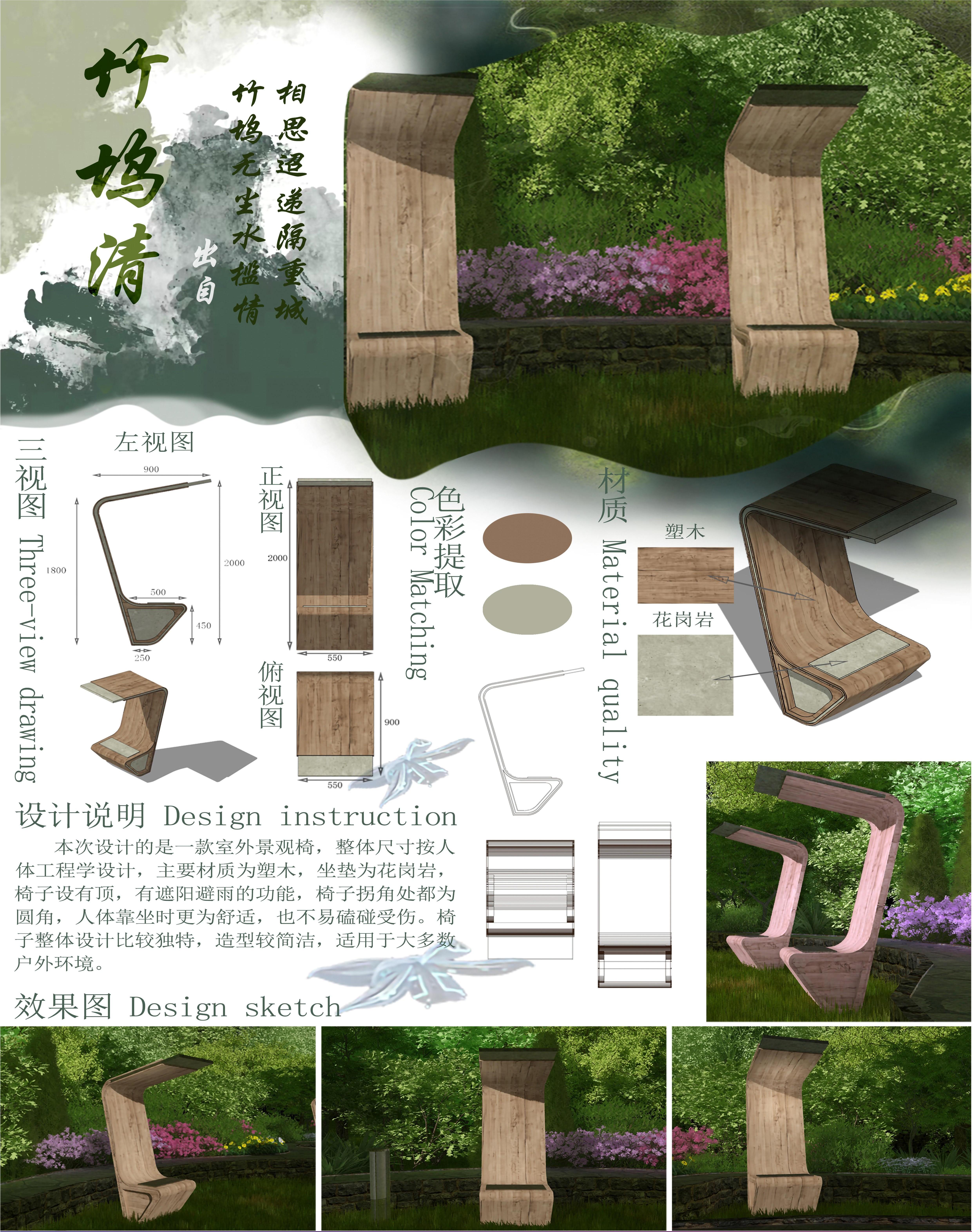 本次设计的是一款室外景观椅,整体尺寸按人体工程学设计,主要材质为塑木,坐垫为花岗岩,椅子设有顶,有遮阳避雨的功能。椅子拐角处都为圆角,人体靠坐时更为舒适,也不易磕碰受伤。椅子整体设计比较独特,造型较简洁,适用于大多数户外环境。