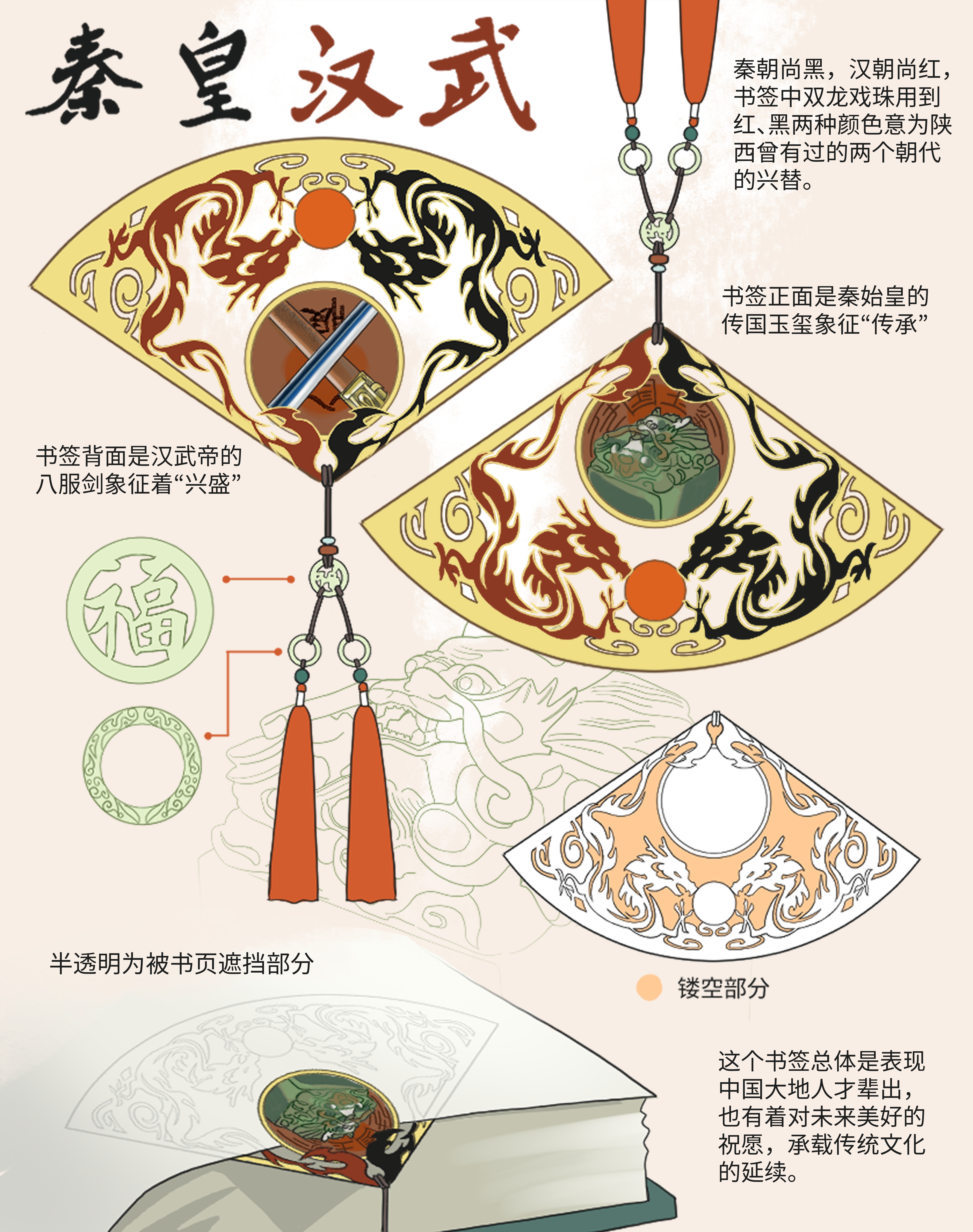 秦朝尚黑,汉朝尚红,书签中双龙戏珠用到红、黑两种颜色意为陕西这片大地曾有过两个朝代的兴替。秦始皇统一了天下而汉武帝扩张了天下,是极为能代表陕西的,书签正面是秦始皇的和氏璧象征“传承”,书签背面是汉武帝的八服剑象征着“兴盛”。而书签挂着的是玉佩挂件,最上面的玉佩刻着“福”,下面两个玉佩是祥云玉佩是对称的,象征着“吉祥”。这个书签总体是表现中国大地人才辈出,也有着对未来美好的祝愿,承载传统文化的延续。
