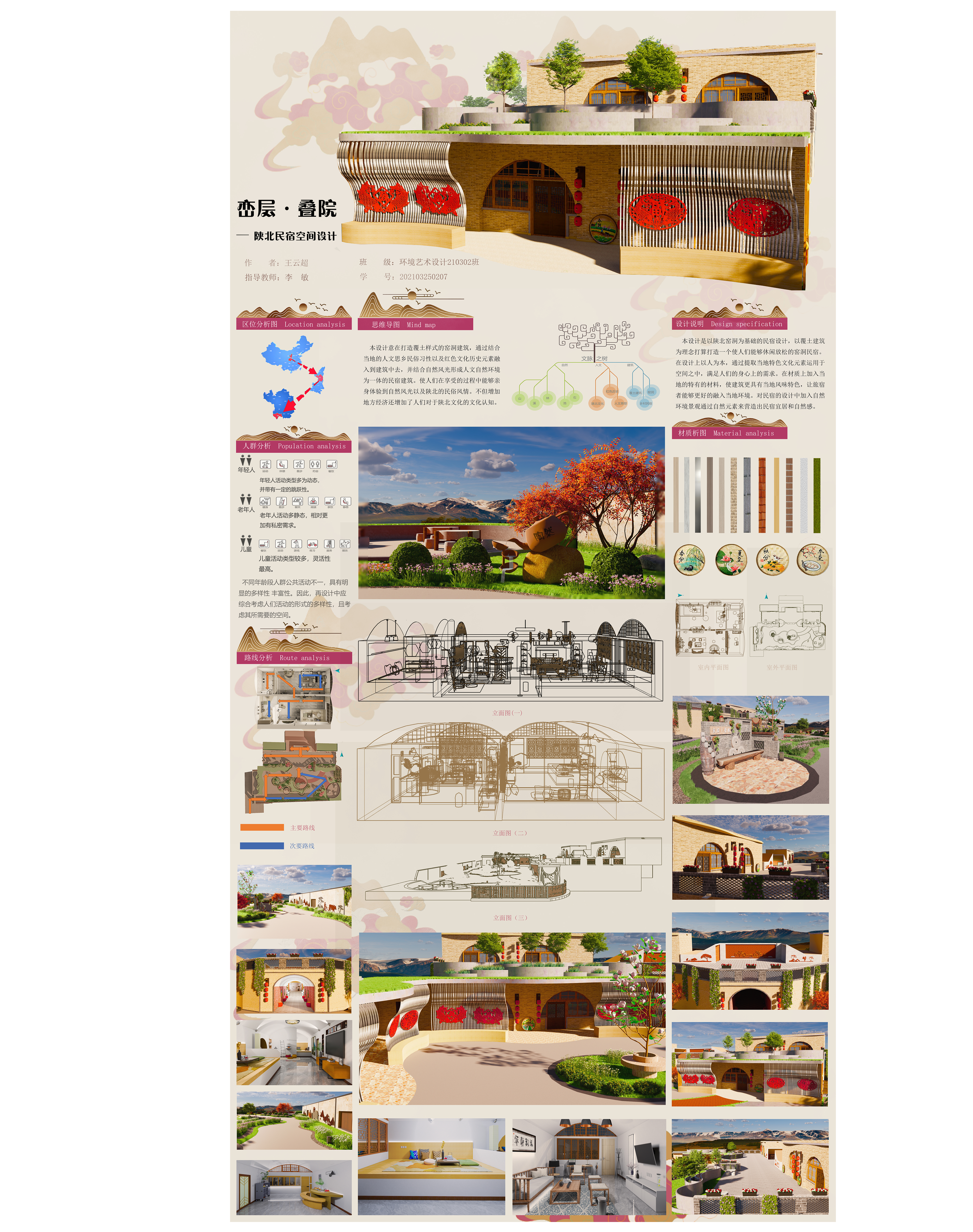 本设计是以陕北窑洞为基础的民宿设计,以覆土建筑为理念打算打造一个使人们能够休闲放松的窑洞民宿。在设计上以人为本,通过提取当地特色文化元素运用于空间之中,满足人们的身心上的需求。在材质上加入当地的特有的材料,使建筑更具有当地风味特色,让旅宿者能够更好的融入当地环境。对民宿的设计中加入自然环境景观通过自然元素来营造出民宿宜居和自然感。