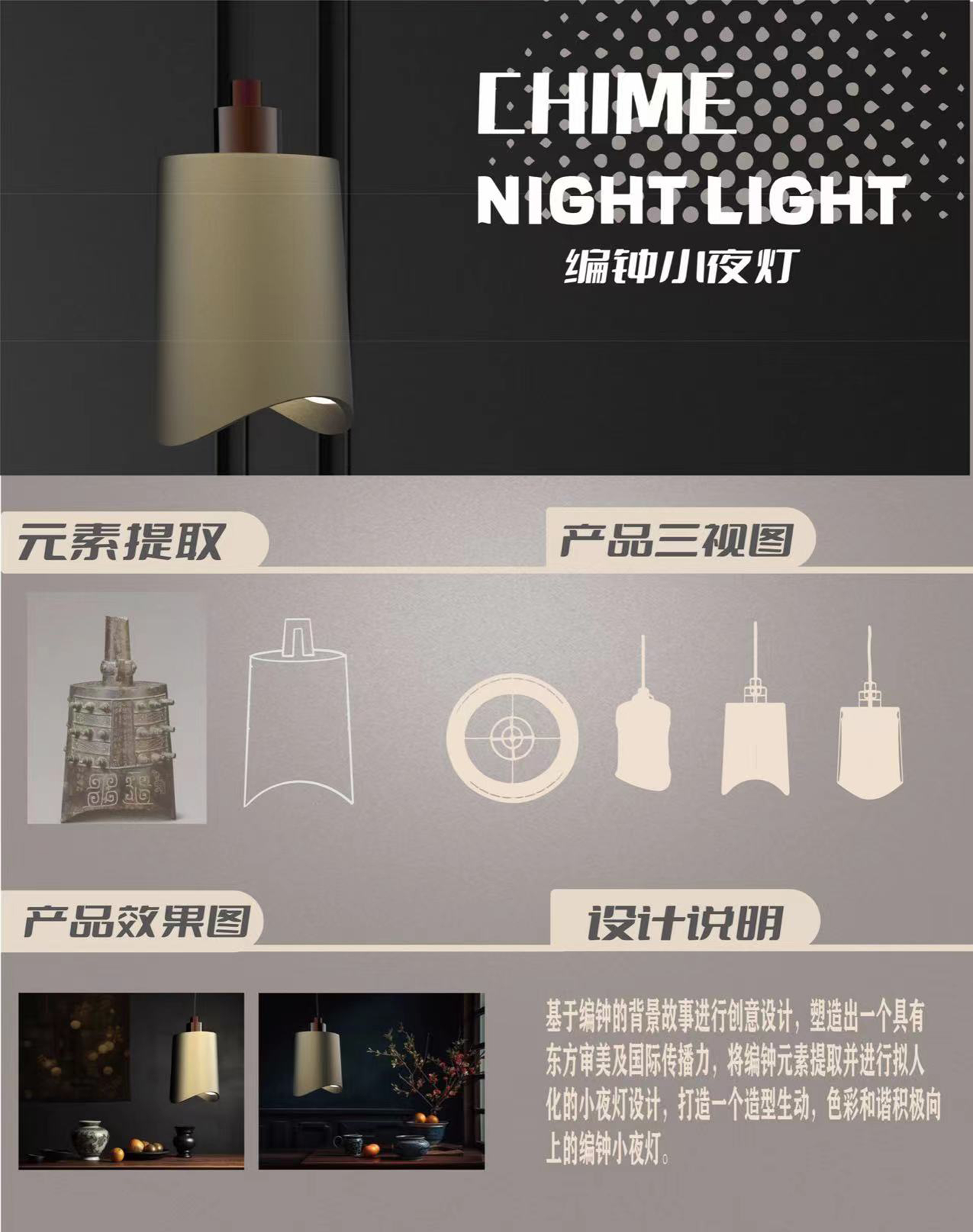 基于编钟的背景故事进行创意设计,塑造出一个具有东方审美及国际传播力,将编钟元素提取并进行小夜灯设计,打造一个造型生动,色彩和谐积极向上的编钟小夜灯。