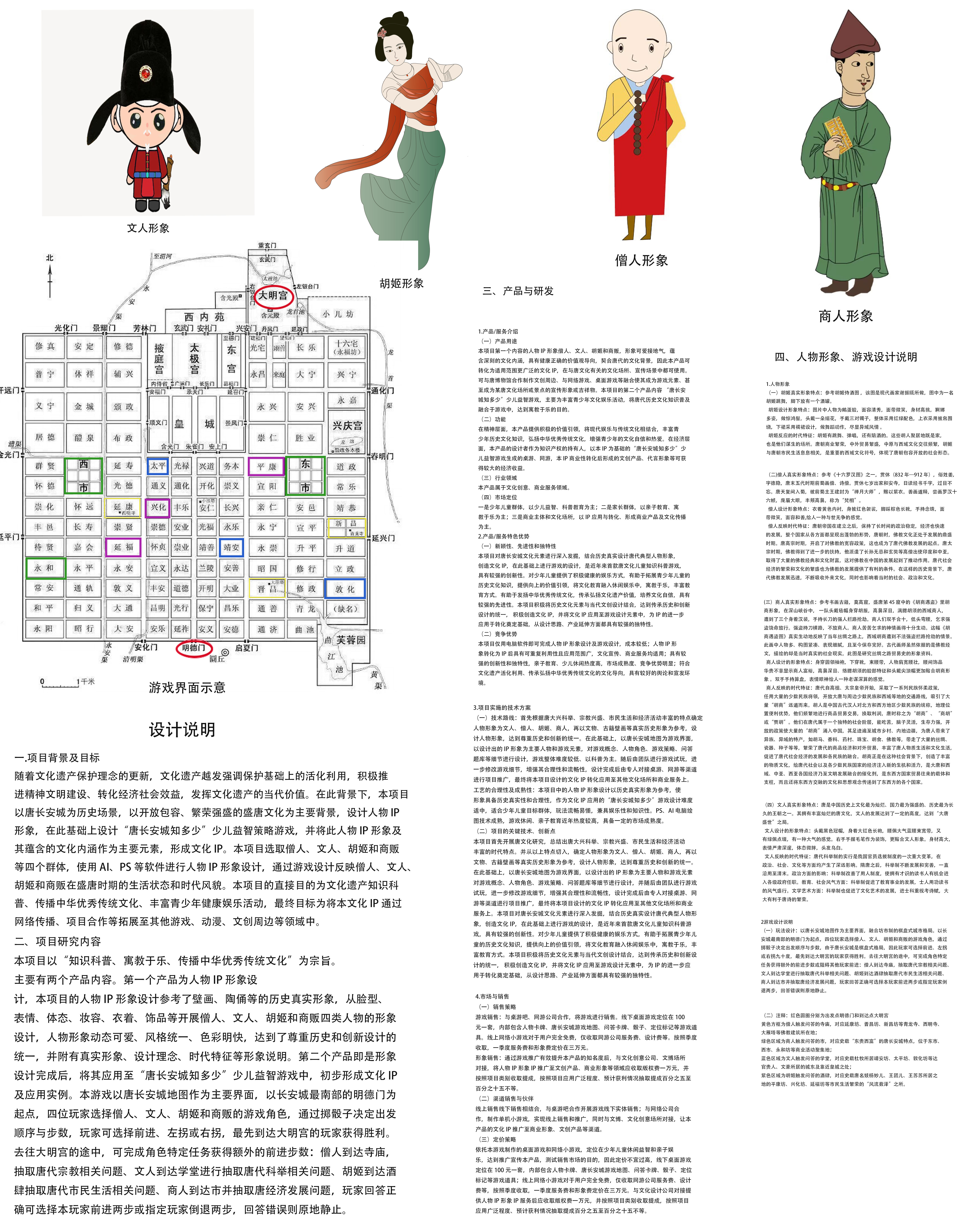 本项目的人物 IP 形象设计参考了壁画、陶俑等的历史真实形象,开展僧人、文人、胡姬和商贩四类人物的形象设计,形象设计完成后,将其应用至“唐长安城知多少”少儿益智游戏中,初步形成文化 IP 及应用实例。本游戏以唐长安城地图作为主要界面,融合以里坊制格局和棋盘式格局,长安城最南部的明德门为起点,四位玩家选择僧人、文人、胡姬和商贩的游戏角色,通过掷骰子决定出发顺序与步数,最先到达大明宫的玩家获得胜利。