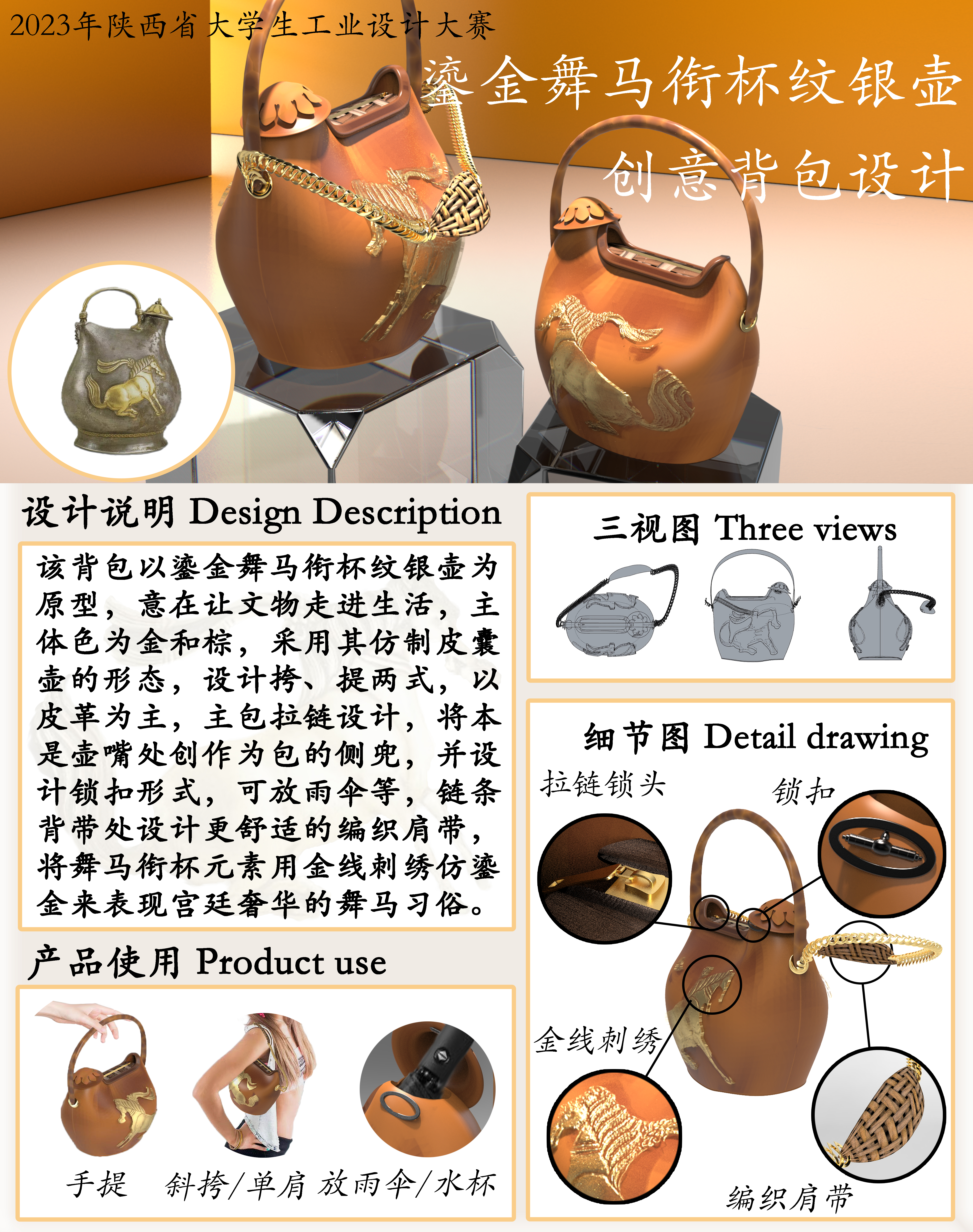 该背包以鎏金舞马衔杯纹银壶为原型,意在让文物走进生活,主体色为金和棕,采用其仿制皮囊壶的形态,设计挎、提两式,以皮革为主,主包拉链设计,将本是壶嘴处创作为包的侧兜,并设计锁扣形式,可放雨伞等,链条背带处设计更舒适的编织肩带,将舞马衔杯元素用金线刺绣仿鎏金来表现宫廷奢华的舞马习俗。