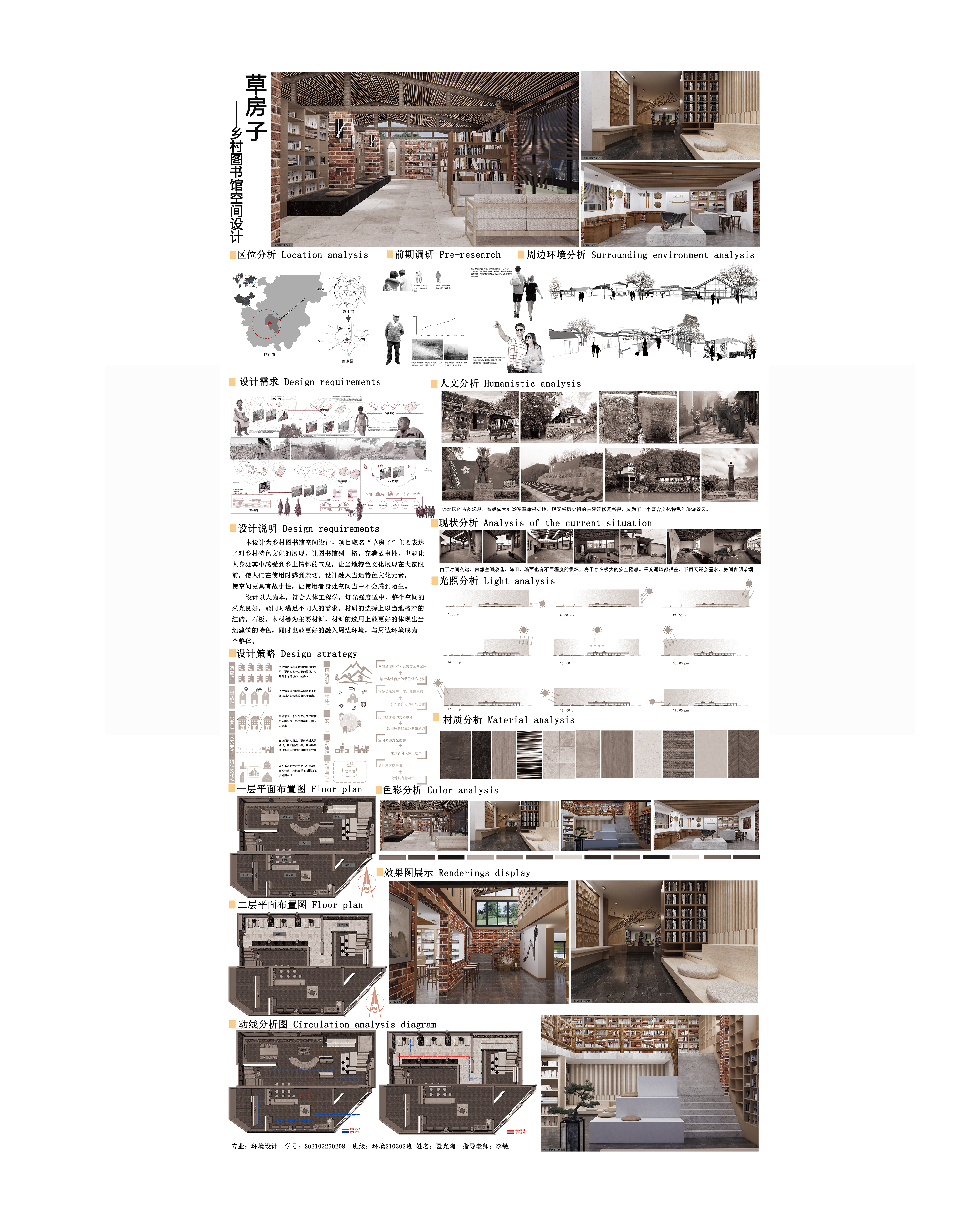 本设计为乡村图书馆空间设计,项目取名“草房子”主要表达了对乡村特色文化的展现,让图书馆别一格,充满故事性,也能让人身处其中感受到乡土情怀的气息,让当地特色文化展现在大家眼前,设计融入当地特色文化元素使空间更具有故事性。 设计符合人体工程学,灯光强度适中,整个空间的采光良好,能同时满足不同人的需求。材料的选用上使用当地盛产的材料,这样能更好的融入周边环境,与周边环境成为一个整体。