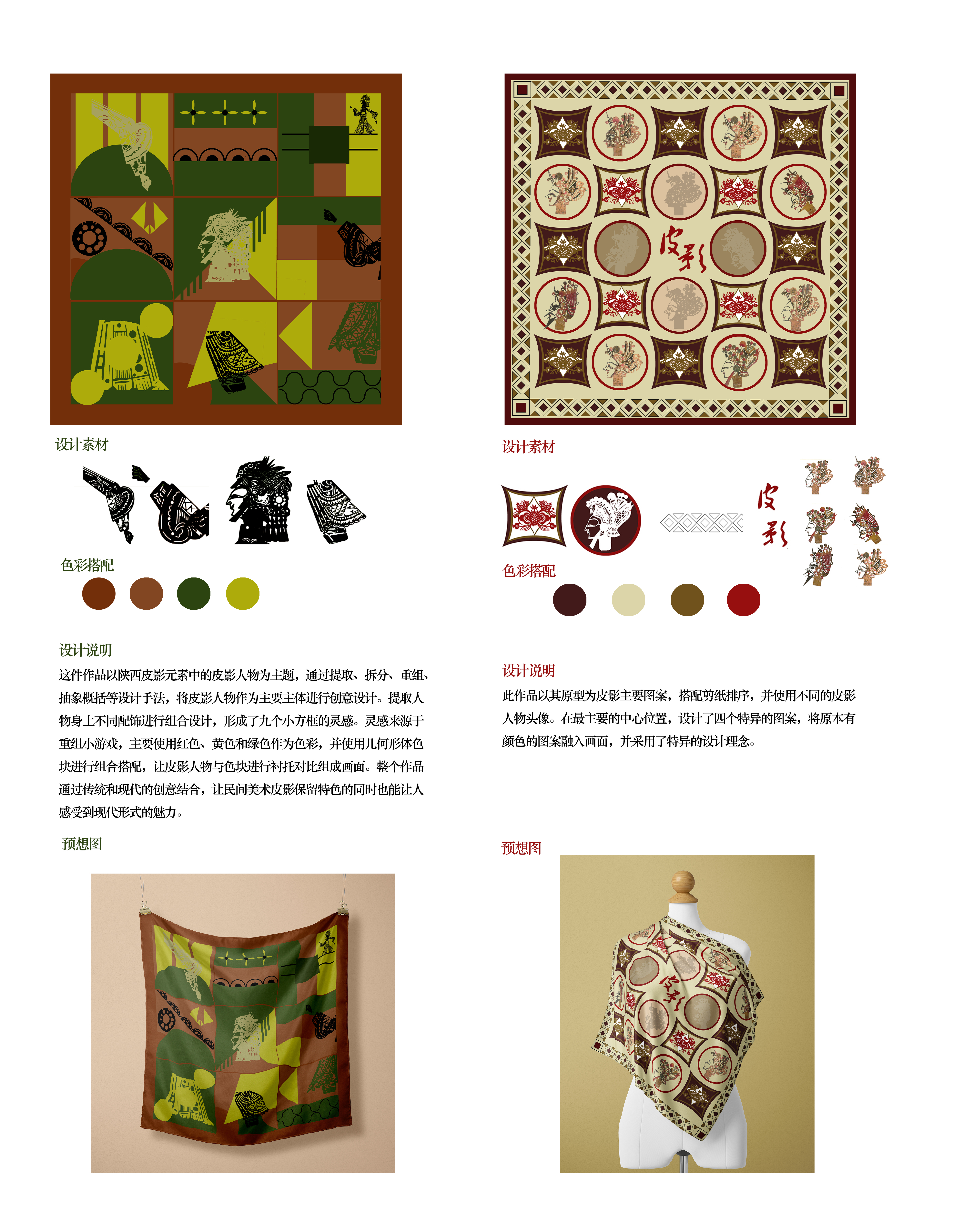 该创作以陕西民俗文化皮影为主要内容,以丝巾为创作主题进行设计调研。通过拆分、重组、颜色对比、抽象概括等方式进行创作。在保留传统的文化的同时,进行新的创作。