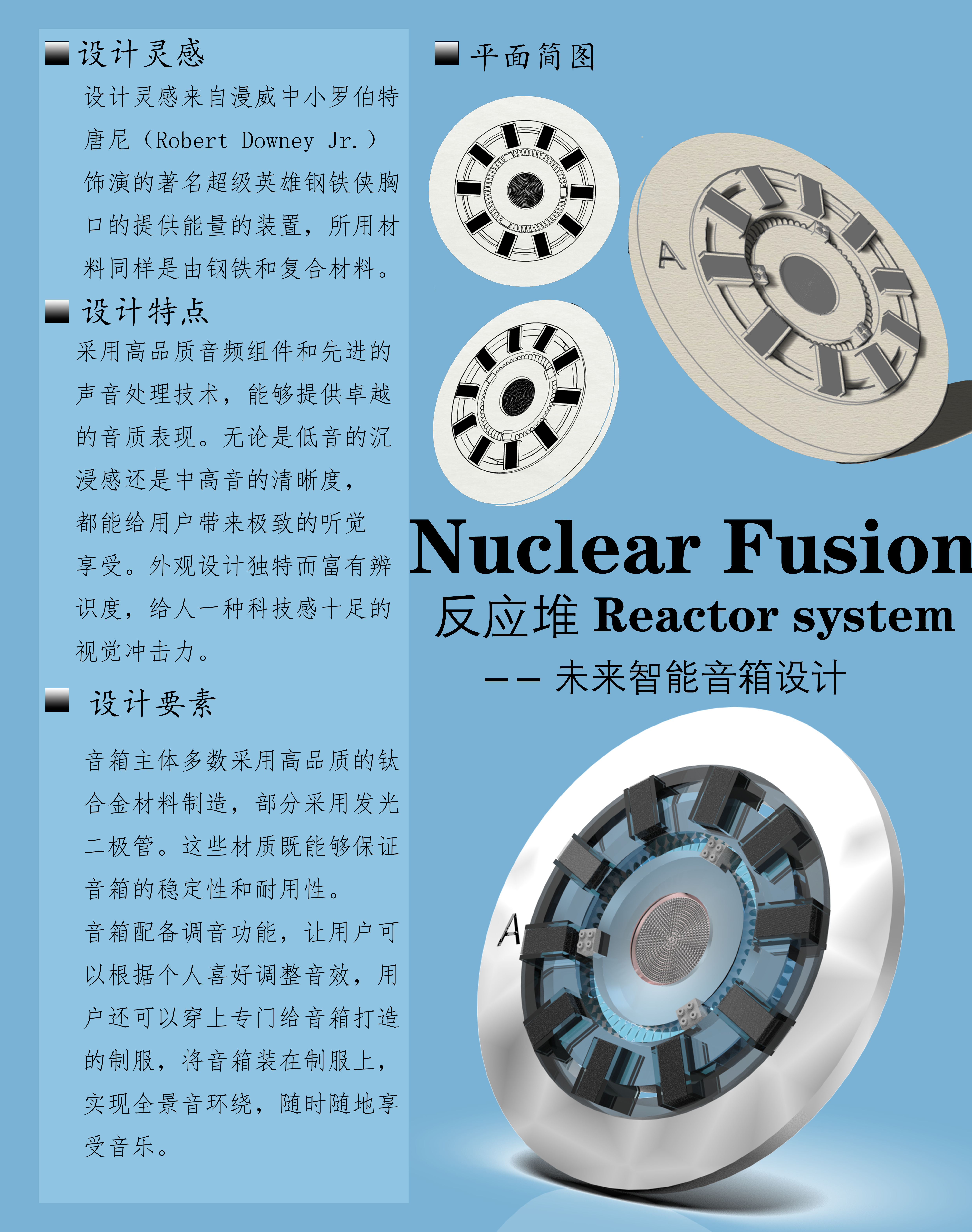 外壳材质:采用高强度合金材料,形状,呈圆柱形状,与钢铁侠反应堆的设计风格相符。使用高品质扬声器和调音技术,提供出色的音质表现,确保清晰而强有力的音乐体验。反应堆动画:在音箱正面,嵌入LED灯条,可模拟钢铁侠反应堆的亮光效果,与音乐节奏同步闪烁。 控制按钮:位于音箱顶部或侧面,包括电源开关、音量控制和播放/暂停等功能按钮。触摸面板:音箱顶部设计触摸面板,可以通过触摸调整音量、切换歌曲等操作。