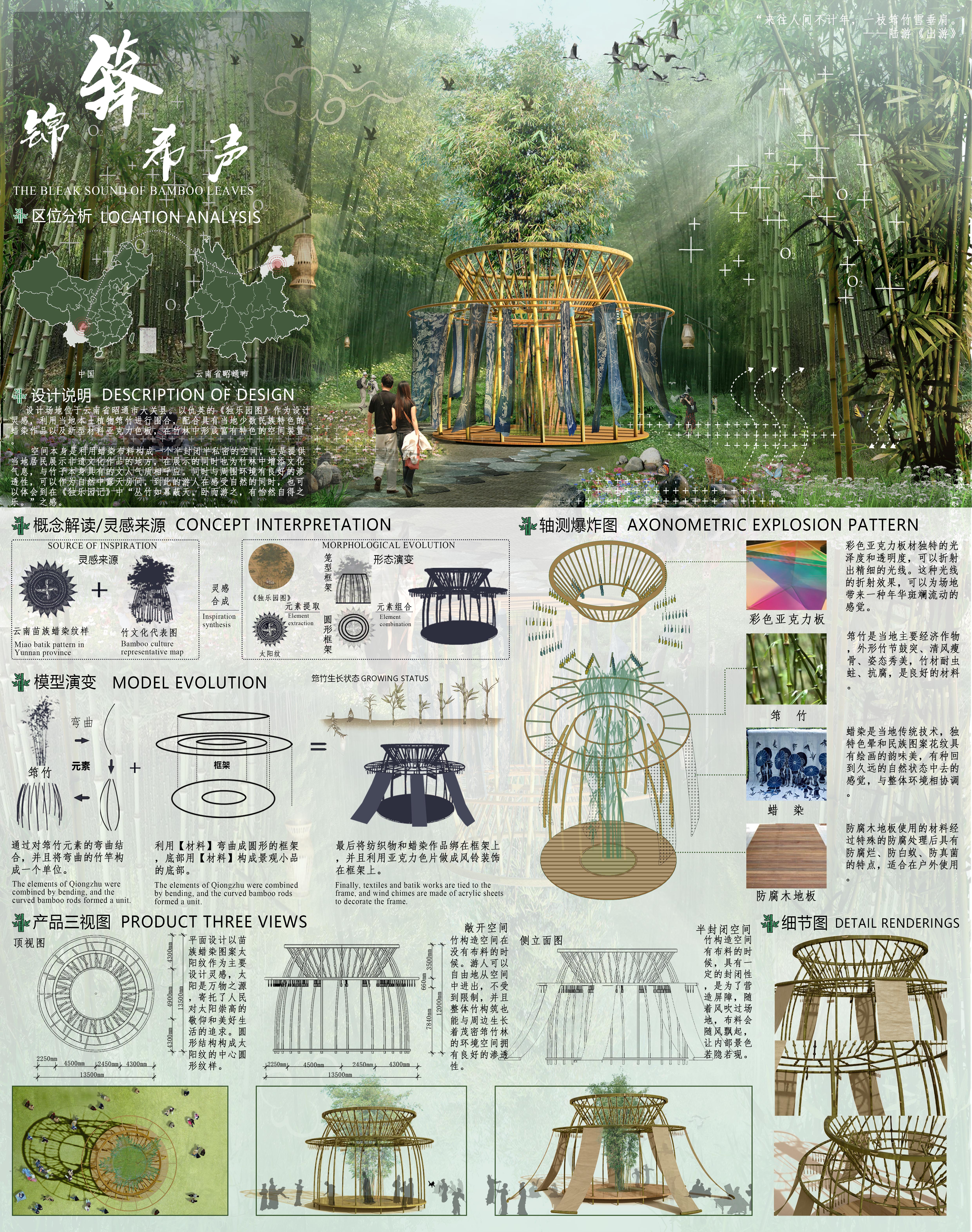 以仇英的《独乐园图》作为设计灵感,利用当地本土植物筇竹进行围合,配合具有当地少数民族特色的蜡染作品以及新型材料亚克力色板,在竹林中形成富有特色的空间装置。空间是提供当地居民展示非遗文化作品的地方,在展示的同时也为竹林中增添文化气息,同时与周围环境有良好的渗透性,到此的游人在感受自然的同时,也可以体会到在《独乐园记》中“丛竹如幕蔽天,卧而游之,有怡然自得之乐。”之感。