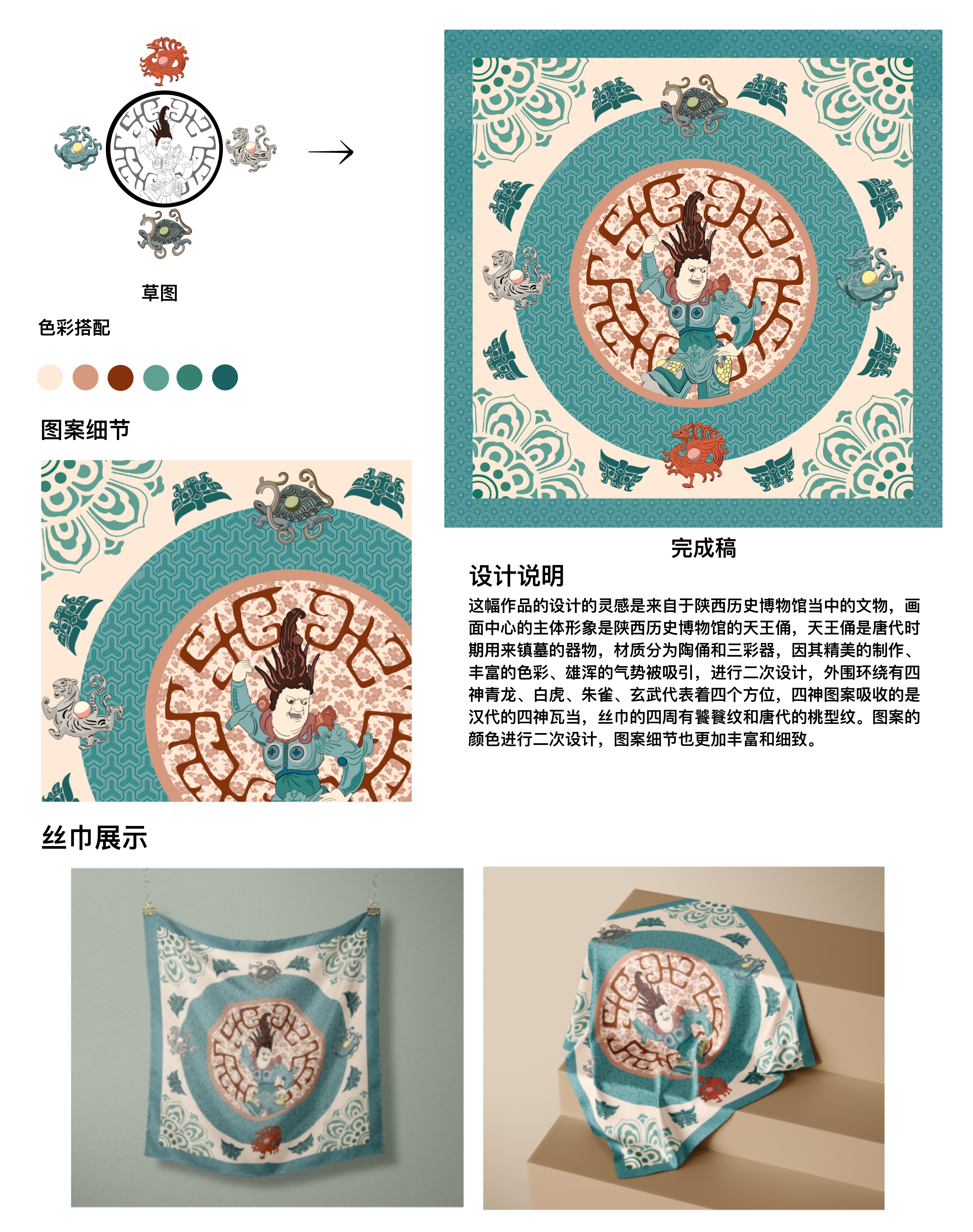这幅作品的设计的灵感是来自于陕西历史博物馆当中的文物,画面中心的主体形象是陕西历史博物馆的天王俑,天王俑是唐代时期用来镇墓的器物,材质分为陶俑和三彩器,因其精美的制作、丰富的色彩、雄浑的气势被吸引,进行二次设计,外围环绕有四神青龙、白虎、朱雀、玄武代表着四个方位,四神图案吸收的是汉代的四神瓦当,丝巾的四周有饕餮纹和唐代的桃型纹。图案的颜色进行二次设计,图案细节也更加丰富和细致。