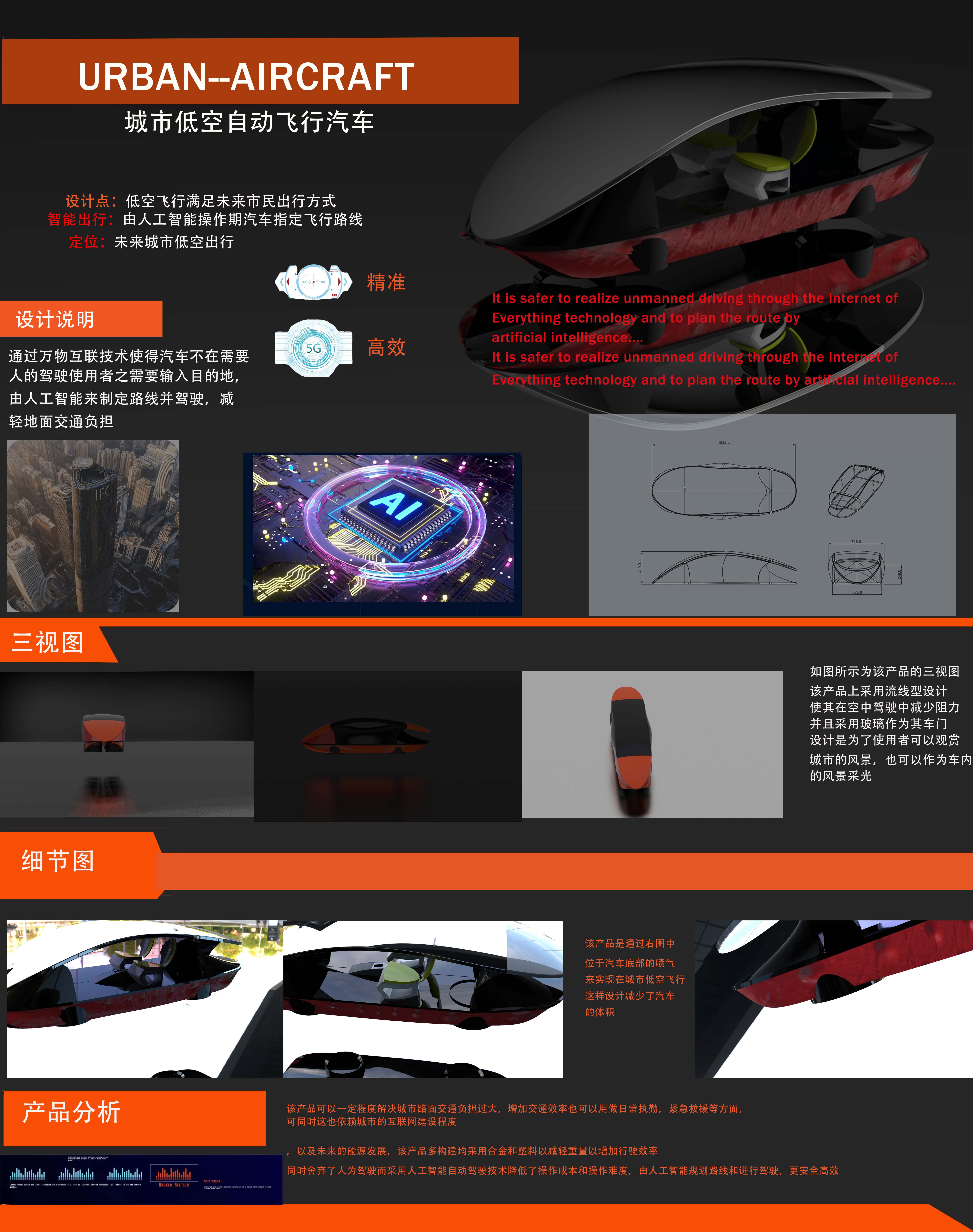 该产品可以一定程度解决城市路面交通负担过大,增加交通效率也可以用做日常执勤,紧急救援等方面,可同时这也依赖城市的互联网建设程度,以及未来的能源发展,该产品多构建均采用合金和塑料以减轻重量以增加行驶效率,同时舍弃了人为驾驶而采用人工智能自动驾驶技术降低了操作成本和操作难度,由人工智能规划路线和进行驾驶,更安全高效