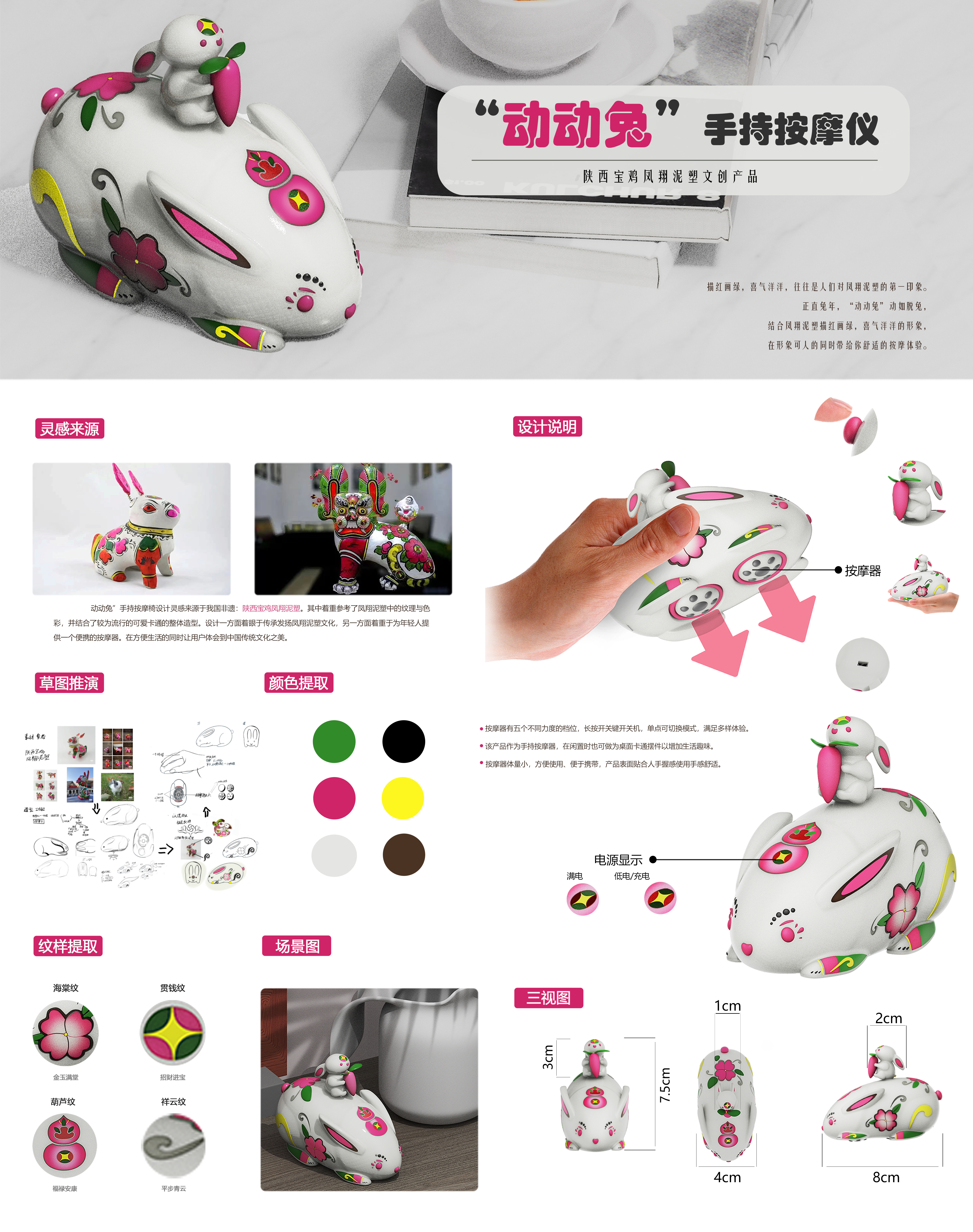 描红画绿,喜气洋洋,往往是人们对凤翔泥塑的第一印象。 正直兔年,“动动免”动如脱兔,动动兔”手持按摩仪设计灵感来源于我国非遗: 陕西宝鸡凤翔泥塑。其中着重参考了凤翔泥塑中的纹理与彩,并结合了较为流行的可爱卡通的整体造型。 设计一方面着眼于传承发扬凤翔泥塑文化,另一方面着重于为年轻人提供一个便携的按摩器。在方便生活的同时让用户体会到中国传统文化之美。