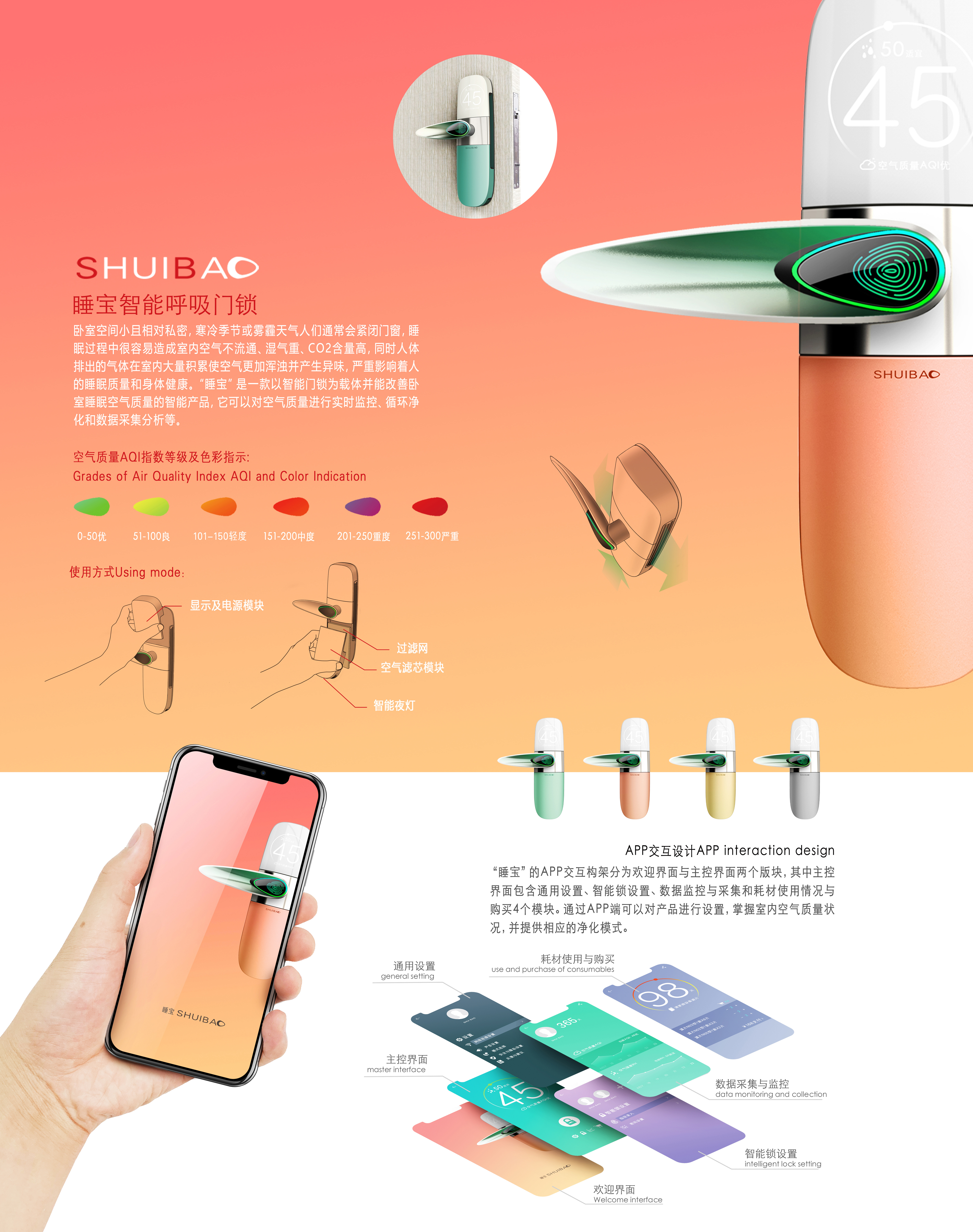 卧室空间小且相对私密,寒冷季节或雾霾天气人们通常会紧闭门窗,睡眠过程中很容易造成室内空气不流通、湿气重、CO2含量高,同时人体排出的气体在室内大量积累使空气更加浑浊并产生异味,严重影响着人的睡眠质量和身体健康。“睡宝”是一款以智能门锁为载体并能改善卧室睡眠空气质量的智能产品,它可以对空气质量进行实时监控、循环净化和数据采集分析等。