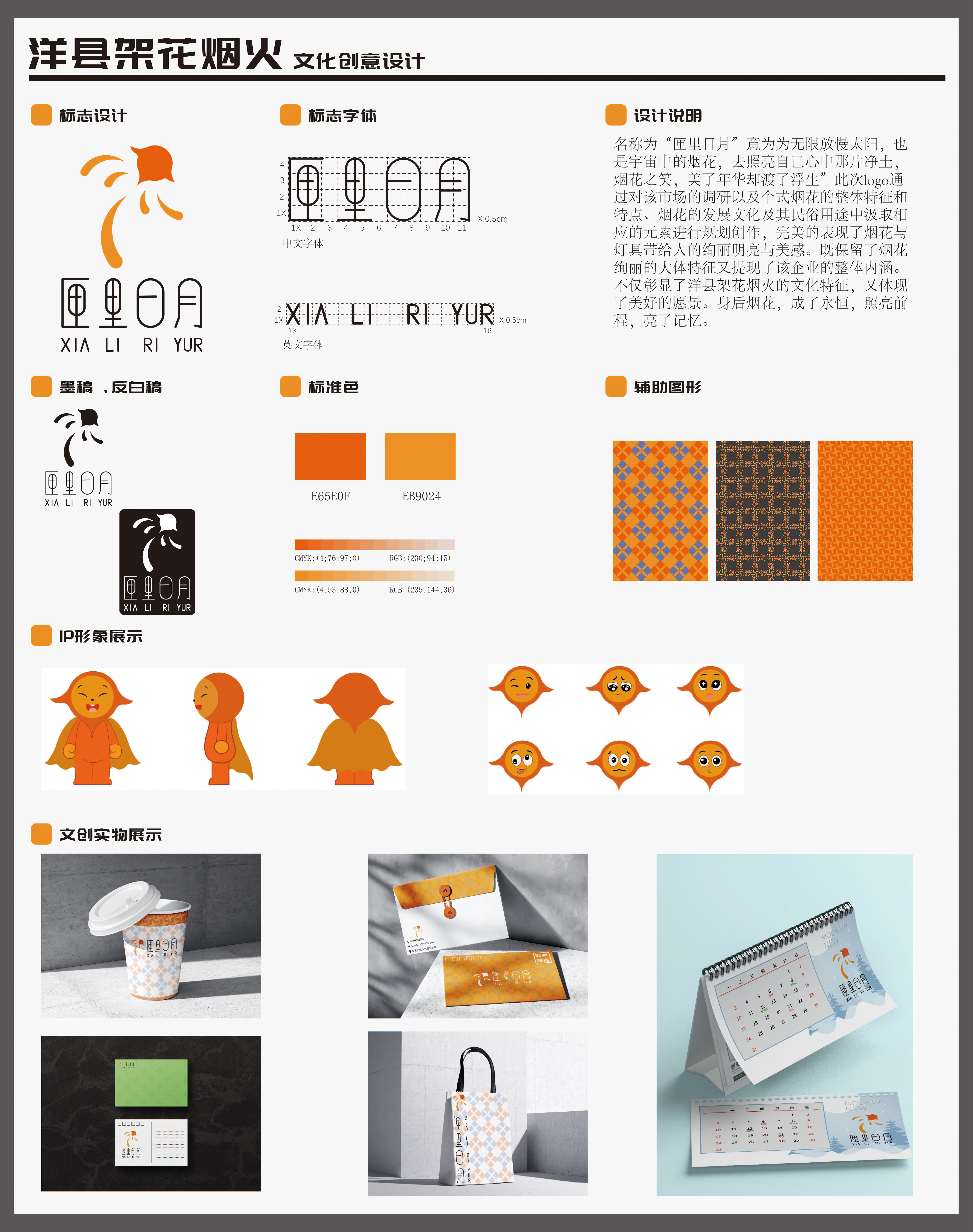 匣里日月——洋县架花烟火的文化创意产品设计说明 “匣里日月”是一款以洋县架花烟火为灵感的文化创意产品,旨在通过独特的设计和创新的理念,让更多人了解和感受洋县架花烟火的魅力。 产品设计理念:以中国传统文化中的“天圆地方”和“阴阳平衡”为设计元素,结合洋县架花烟火的特色和技艺,打造出一款具有文化内涵和审美价值的产品。