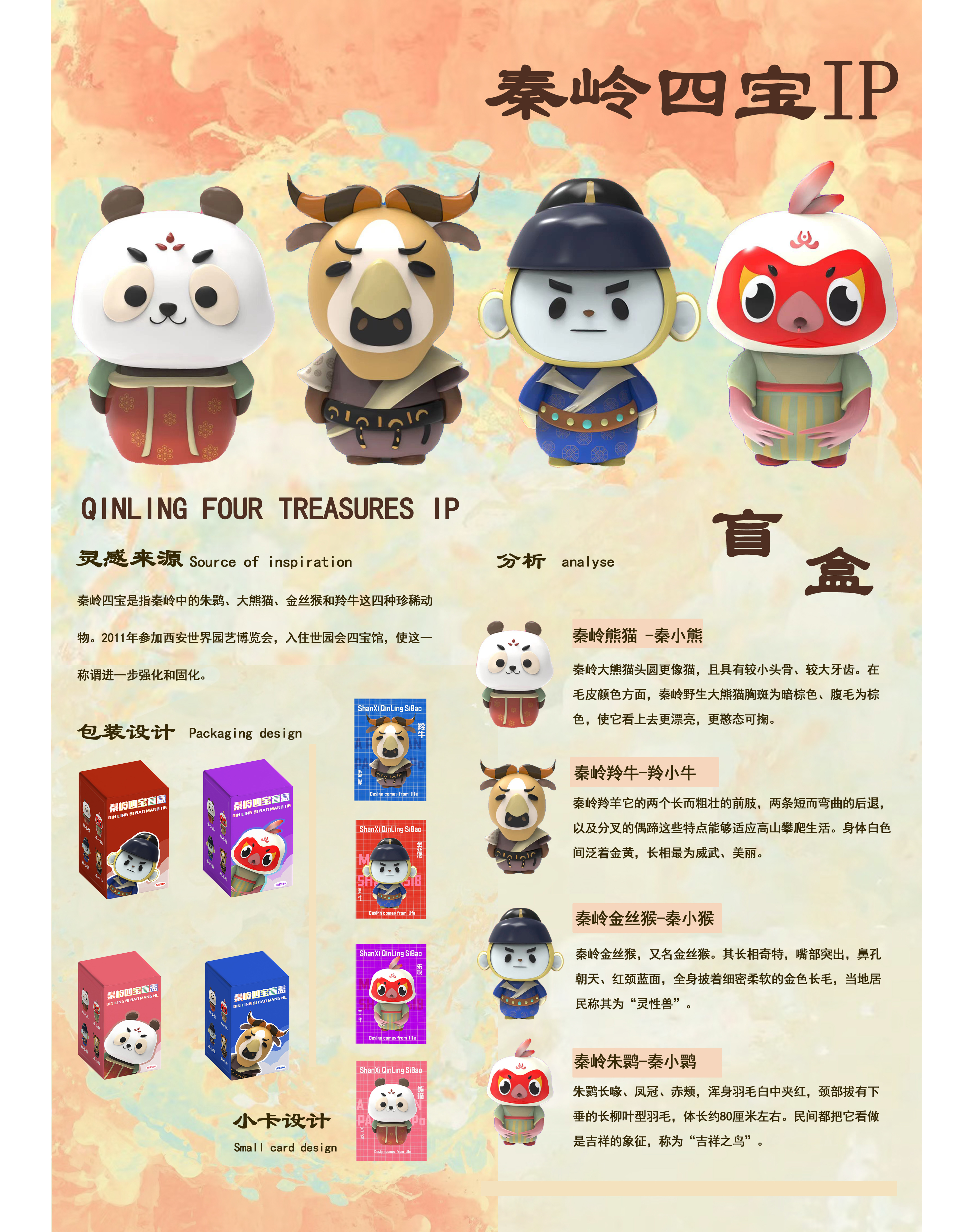 秦岭四宝为生活在陕西秦岭的四种珍贵动物,也是当地的吉祥物也有好运的加持,给人们带来好运平安等。设计成盲盒能将四种动物推广出去,让更多的人认识以及了解,呼吁人们保护野生动物珍惜环境。