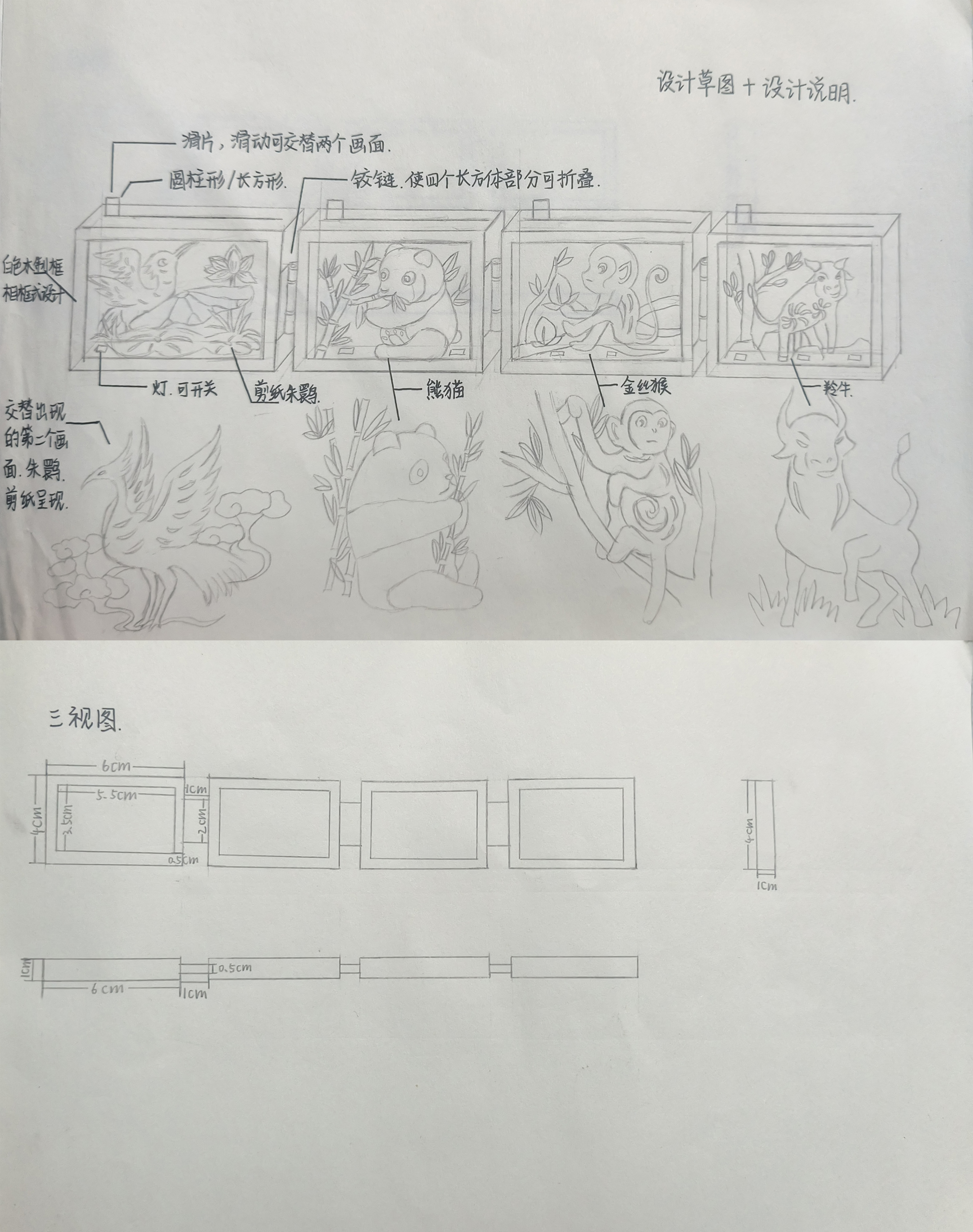 作品的主体设计为可折叠式摆件。主体为四个木质长方体,中间用铰链相连,起到了可以折叠以至于节省空间,收纳方便的作用。摆件中间呈现的为陕西四宝朱鹮,熊猫,金丝猴,羚牛的剪纸图片,并设置有一个滑片起到了使剪纸画面交替出现的作用。并且在内部设有可以开关的小灯,让作品不仅仅是一个摆件,同时也可以当做小夜灯使用。本作品将非物质文化遗产剪纸与陕西四大保护动物相结合,即展示了非遗剪纸,也使陕西的保护动物具象化。