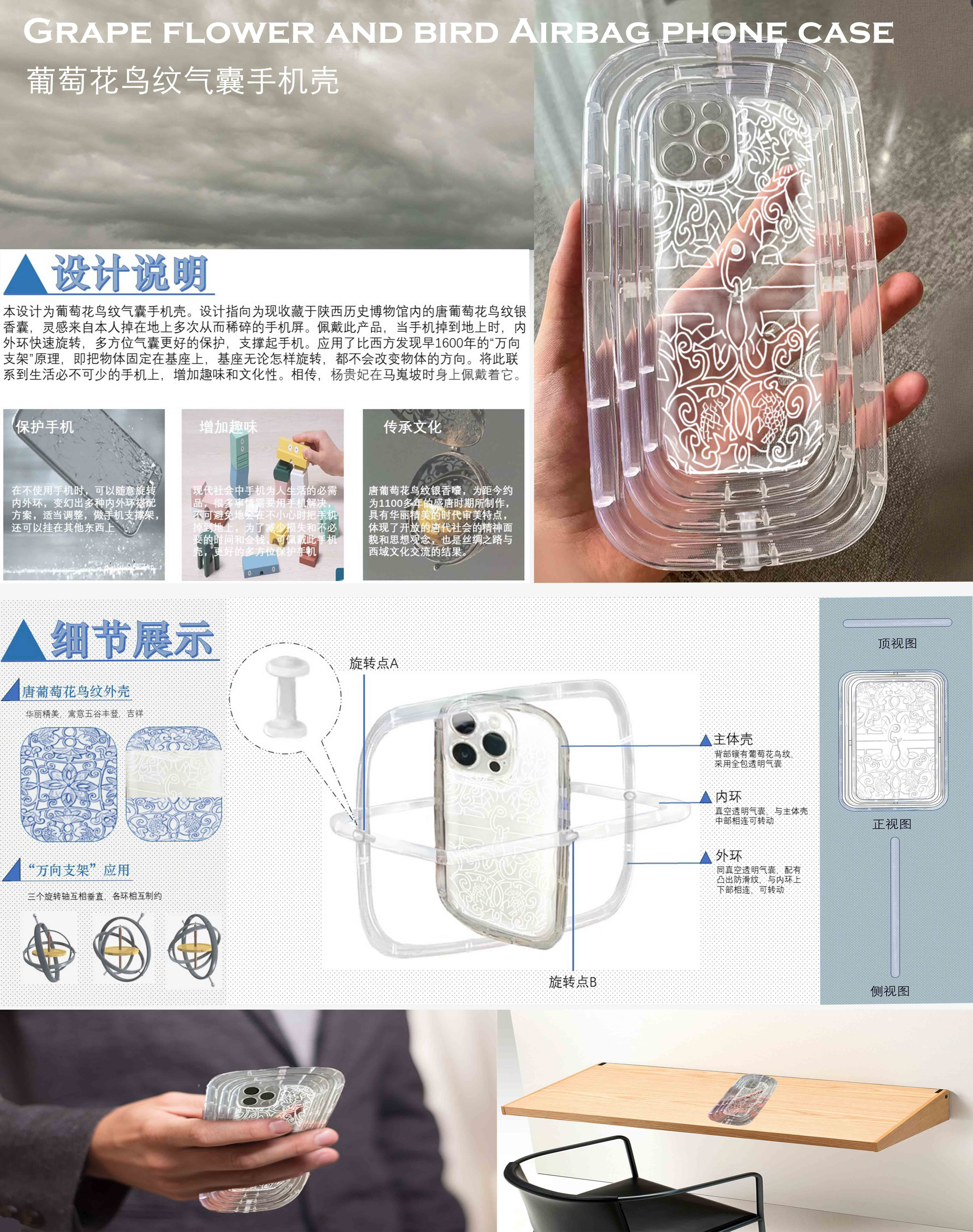 本设计为葡萄花鸟纹气囊手机壳。设计指向为现收藏于陕西历史博物馆内的唐葡萄花鸟纹银香囊,灵感来自本人掉在地上多次的稀碎的手机屏。佩戴此产品,当手机掉到地上时内外环迅速旋转,多方位气囊更好的保护手机。应用了比西方发现早1600年的“万向支架”原理,即将物体固定在基座上,基座无论怎样旋转,都不会改变物体的方向。将此联系到生活必不可少的手机上,增加趣味和文化性。相传,杨贵妃在马嵬坡时身上佩戴着它。