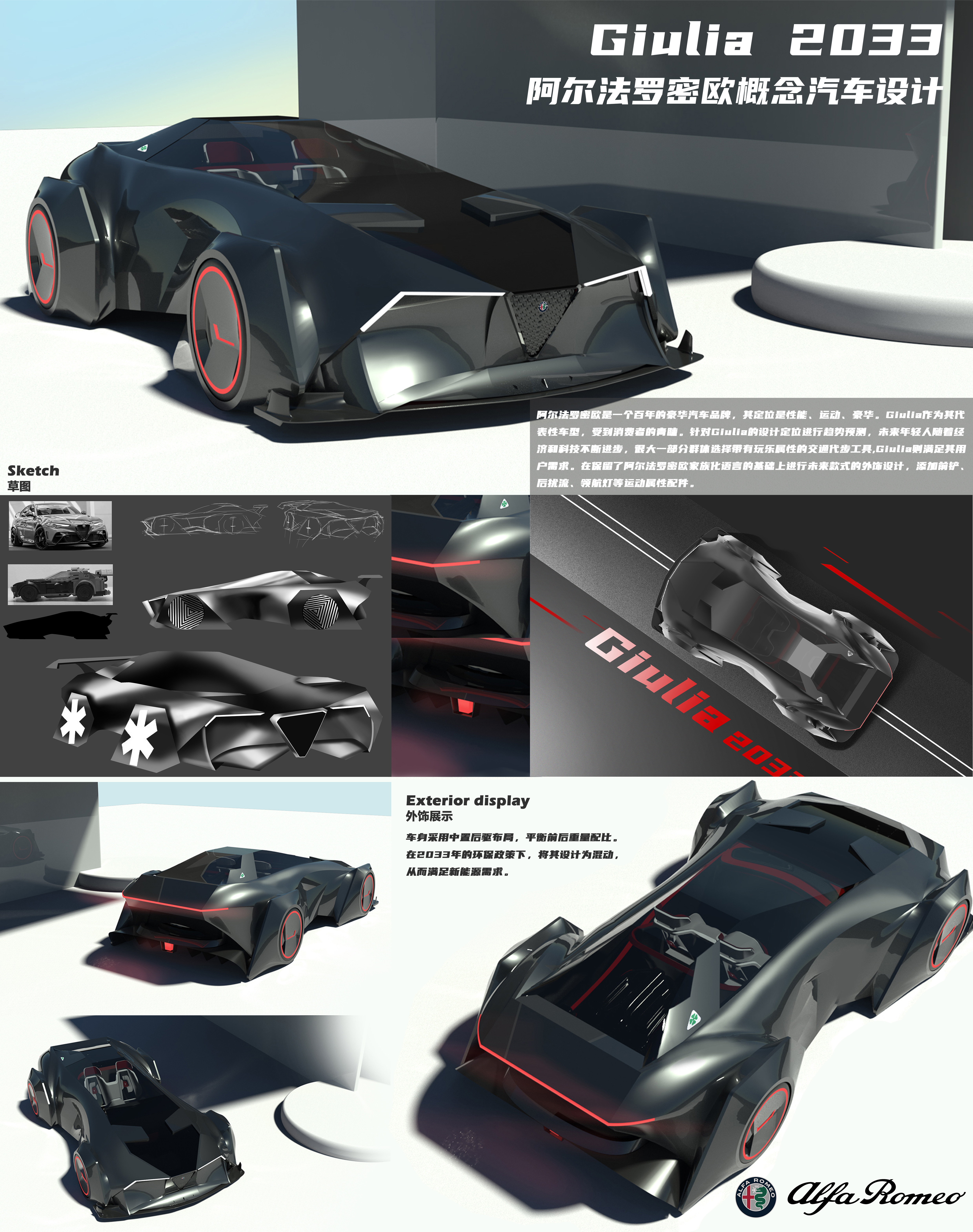 阿尔法罗密欧是一个百年的豪华汽车品牌,其定位是性能、运动、豪华。Giulia作为其代表性车型,受到消费者的青睐。针对Giulia的设计定位进行趋势预测,未来年轻人随着经济和科技不断进步,很大一部分群体选择带有玩乐属性的交通代步工具,Giulia则满足其用户需求。在保留了阿尔法罗密欧家族化语言的基础上进行未来款式的外饰设计,添加前铲、后扰流、领航灯等运动属性配件。