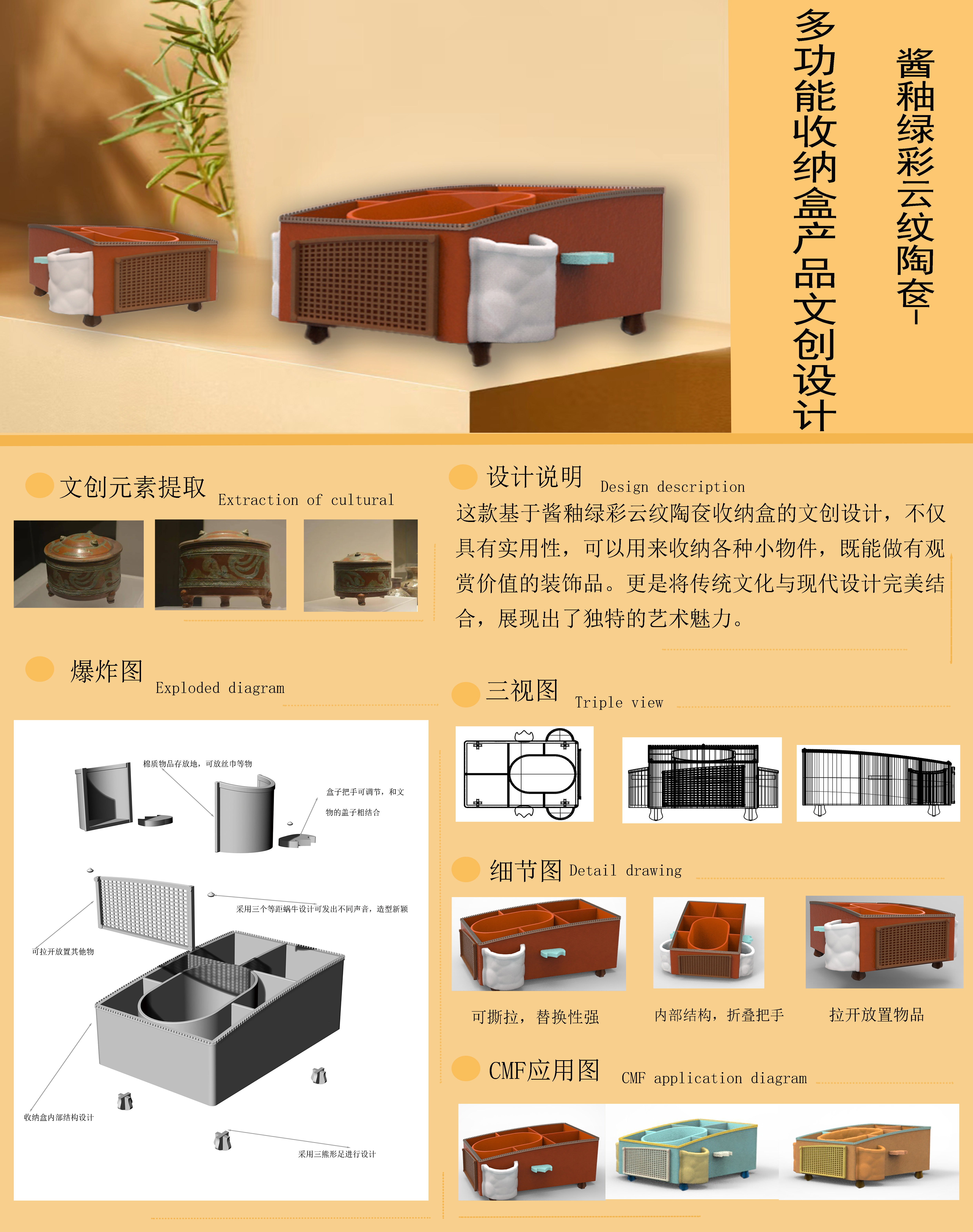 这款基于酱釉绿彩云纹陶奁收纳盒的文创设计,不仅具有实用性,可以用来收纳各种小物件,既能做有观赏价值的装饰品。更是将传统文化与现代设计完美结合,展现出了独特的艺术魅力。